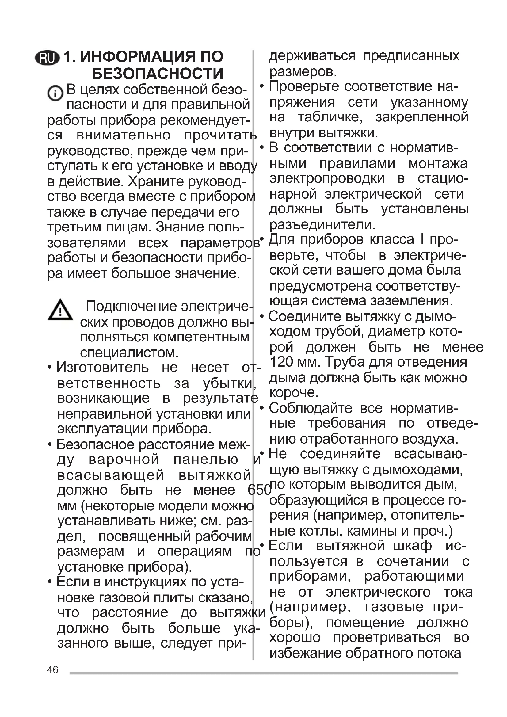- Если вытяжной шкаф ис- пользуется в сочетании с приборами, работающими не от электрического тока (например, газовые при- боры), помещение должно хорошо проветриваться во избежаниеобратногопотока RU47 отходящихгазов.Приполь- зованиикухоннойвытяжкой в сочетании с приборами, работающиминеотэлектри- ческоготока,отрицательное давление в помещении не должнопревышать0,04мбар стем,чтобыдымневсасы- вался вытяжкой обратно в