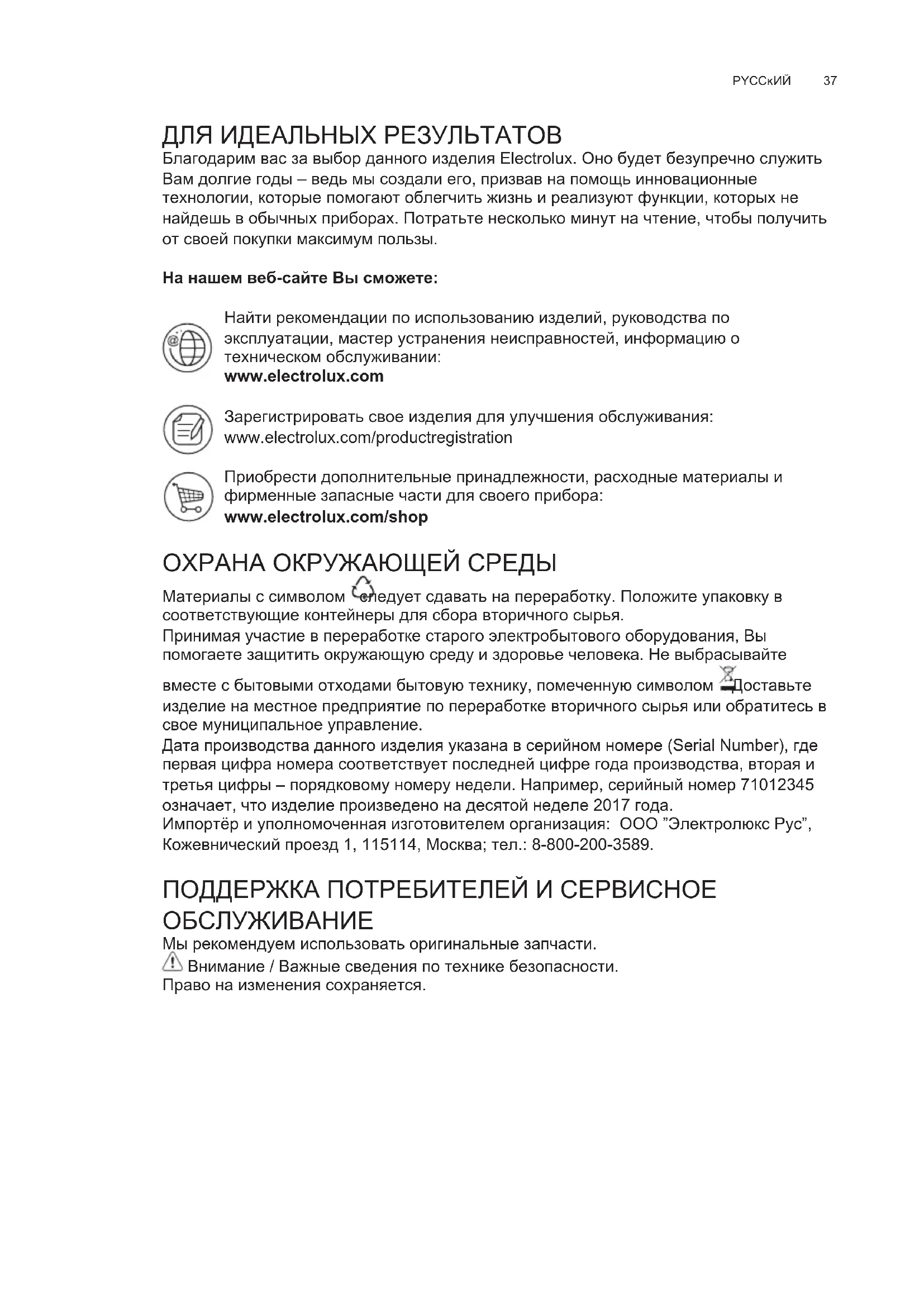 udsugningseffekt Benyt den højeste hastighed ved stor dampkoncentration i køkkenet. Det anbefales, at man tænder udsugningen 5 minutter før påbegyndelse af madlavning, og at udsugningen efterlades tændt i yderligere cirka 15 minutter efter afslutning af madlavningen BELYSNING Afbryd apparatet fra el-nettet Pas på! Sørg for at pærerne er kolde før de berøres. Udskift den beskadigede pære. Benyt kun kerteformede halogenpærer Ø35mm E14 28W37 PYCCĸИЙ ДЛЯ ИДЕАЛЬНЫХ РЕЗУЛЬТАТОВ Благодарим вас за выбор данного изделия Electrolux. Оно будет безупречно служить Вам долгие годы – ведь мы создали его, призвав на помощь инновационные технологии, которые помогают облегчить жизнь и реализуют функции, которых не найдешь в обычных приборах. Потратьте несколько минут на чтение, чтобы получить от своей покупки максимум пользы. На нашем веб-сайте Вы сможете: Найти рекомендации по использованию изделий, руководства по эксплуатации, мастер устранения неисправностей, информацию о техническом обслуживании: www.electrolux.com Зарегистрировать свое изделия для улучшения обслуживания: wwwelectroluxcom/productregistration Приобрести дополнительные принадлежности, расходные материалы и фирменные запасные части для своего прибора: www.electrolux.com/shop ОХРАНА ОКРУЖАЮЩЕЙ СРЕДЫ Материалы с символом следует сдавать на переработку. Положите упаковку в соответствующие контейнеры для сбора вторичного сырья. Принимая участие в переработке старого электробытового оборудования, Вы помогаете защитить окружающую среду и здоровье человека. Не выбрасывайте вместе с бытовыми отходами бытовую технику, помеченную символом . Доставьте изделие на местное предприятие по переработке вторичного сырья или обратитесь в свое муниципальное управление. Дата производства данного изделия указана в серийном номере (Serial Numbеr), где первая цифра номера соответствует последней цифре года производства, вторая и третья цифры – порядковому номеру недели. Например, серийный номер 71012345 означает, что изделие произведено на десятой неделе 2017 года. Импортёр и уполномоченная изготовителем организация: ООО ”Электролюкс Рус”, Кожевнический проезд 1, 115114, Москва; тел.: 8-800-200-3589. ПОДДЕРЖКА ПОТРЕБИТЕЛЕЙ И СЕРВИСНОЕ ОБСЛУЖИВАНИЕ Мы рекомендуем использовать оригинальные запчасти. Внимание / Важные сведения по технике безопасности. Право на изменения сохраняется.