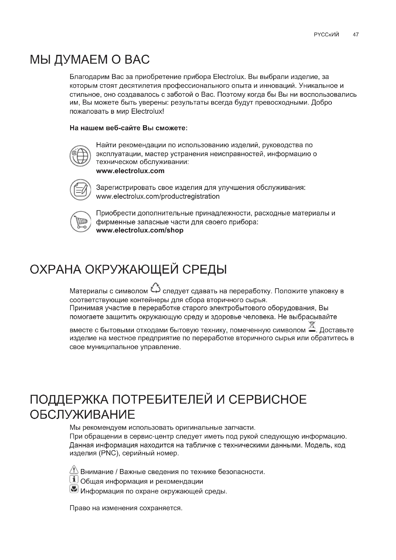 рекомендации по использованию изделий, руководства по эксплуатации, мастер устранения неисправностей, информацию о техническом обслуживании: www.electrolux.com Зарегистрировать свое изделия для улучшения обслуживания: www.electrolux.com/productregistration Приобрести дополнительные принадлежности, расходные материалы и фирменные запасные части для своего прибора: www.electrolux.com/shop ОХРАНА ОКРУЖАЮЩЕЙ СРЕДЫ Материалы с символом следует сдавать на переработку. Положите упаковку в соответствующие контейнеры для сбора вторичного сырья. Принимая участие в переработке старого электробытового оборудования, Вы помогаете защитить окружающую среду и здоровье человека. Не выбрасывайте вместе с бытовыми отходами бытовую технику, помеченную символом . Доставьте изделие на местное предприятие по переработке вторичного сырья или обратитесь в свое муниципальное управление. ПОДДЕРЖКА ПОТРЕБИТЕЛЕЙ И СЕРВИСНОЕ ОБСЛУЖИВАНИЕ Мы рекомендуем использовать оригинальные запчасти. При обращении в сервис-центр следует иметь под рукой следующую информацию. Данная информация находится на табличке с техническими данными. Модель, код изделия (PNC), серийный номер. Внимание / Важные сведения по технике безопасности. Общая информация и рекомендации Информация по охране окружающей среды. Право на изменения сохраняется. RU РУК