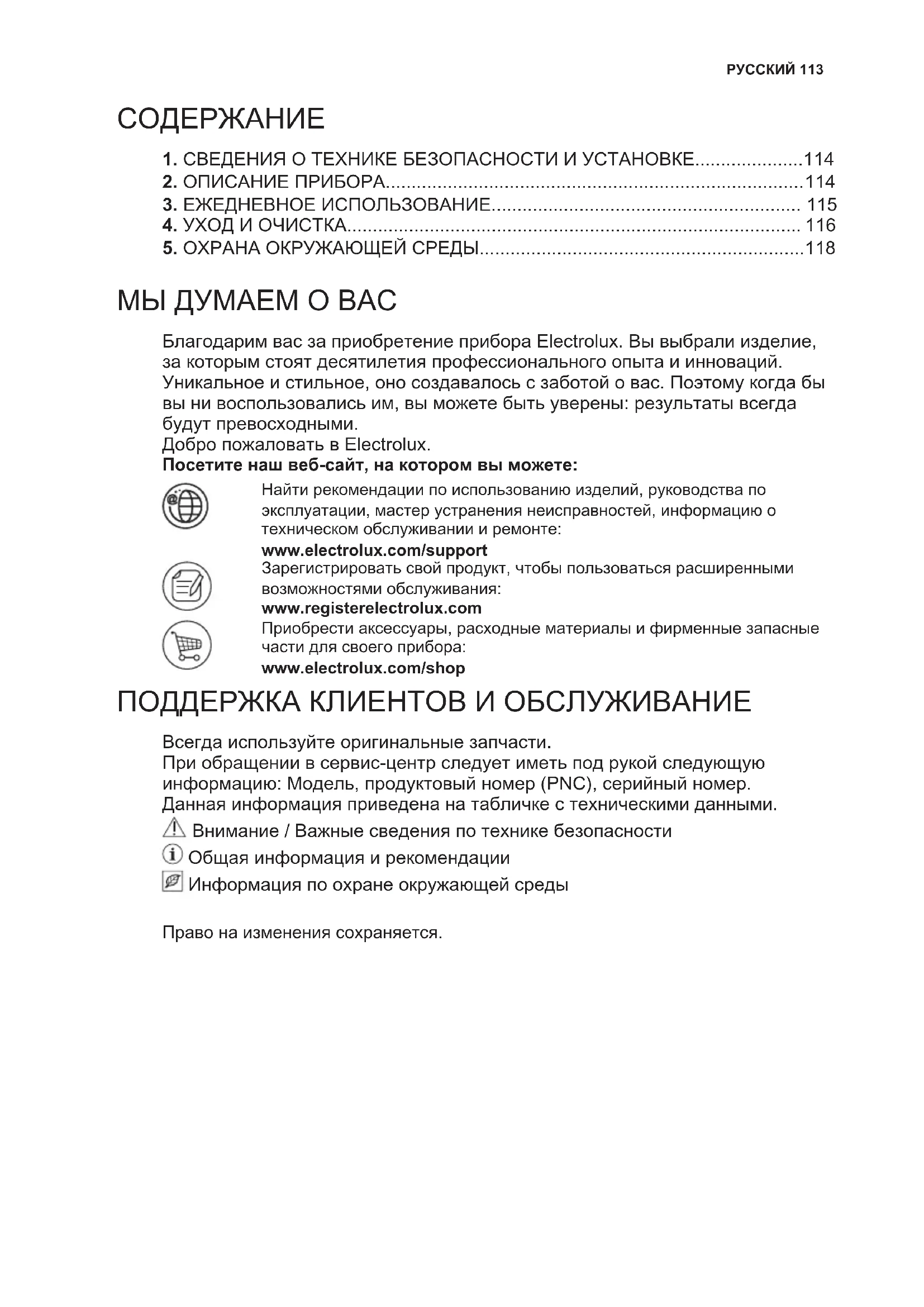 МЫ ДУМАЕМ О ВАС Благодарим вас за приобретение прибора Electrolux. Вы выбрали изделие, за которым стоят десятилетия профессионального опыта и инноваций. Уникальное и стильное, оно создавалось с заботой о вас. Поэтому когда бы вы ни воспользовались им, вы можете быть уверены: результаты всегда будут превосходными. Добро пожаловать в Electrolux. Посетите наш веб-сайт, на котором вы можете: Найти рекомендации по использованию изделий, руководства по эксплуатации, мастер устранения неисправностей, информацию о техническом обслуживании и ремонте: www.electrolux.com/support Зарегистрировать свой продукт, чтобы пользоваться расширенными возможностями обслуживания: www.registerelectrolux.com Приобрести аксессуары, расходные материалы и фирменные запасные части для своего прибора: www.electrolux.com/shop ПОДДЕРЖКА КЛИЕНТОВ И ОБСЛУЖИВАНИЕ Всегда используйте оригинальные запчасти. При обращении в сервис-центр следует иметь под рукой следующую информацию: Модель, продуктовый номер (PNC), серийный номер. Данная информация приведена на табличке с техническими данными. Внимание / Важные сведения по технике безопасности Общая информация и рекомендации Информация по охране окружающей среды Право на изменения сохраняется. РУССКИЙ 1131. СВЕДЕНИЯ О ТЕХНИКЕ БЕЗОПАСНОСТИ И