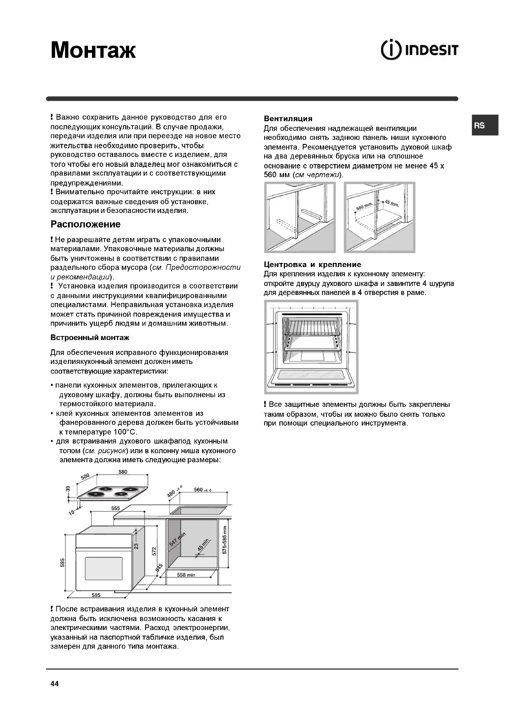 ! Важно сохранить данное руководство для его последующих консультаций. В случае продажи, передачи изделия или при переезде на новое место жительства необходимо проверить, чтобы руководство оставалось вместе с изделием, для того чтобы его новый владелец мог ознакомиться с правилами эксплуатации и с соответствующими предупреждениями. ! Внимательно прочитайте инструкции: в них содержатся важные сведения об установке, эксплуатации и безопасности изделия. Расположение ! Не разрешайте детям играть с упаковочными материалами. Упаковочные материалы должны быть уничтожены в соответствии с правилами раздельного сбора мусора (см. Предосторожности и рекомендации). ! Установка изделия производится в соответствии с данными инструкциями квалифицированными специалистами. Неправильная установка изделия может стать причиной повреждения имущества и причинить ущерб людям и домашним животным. Встроенный монтаж Для обеспечения исправного функционирования изделиякухонный элемент должен иметь соответствующие характеристики: