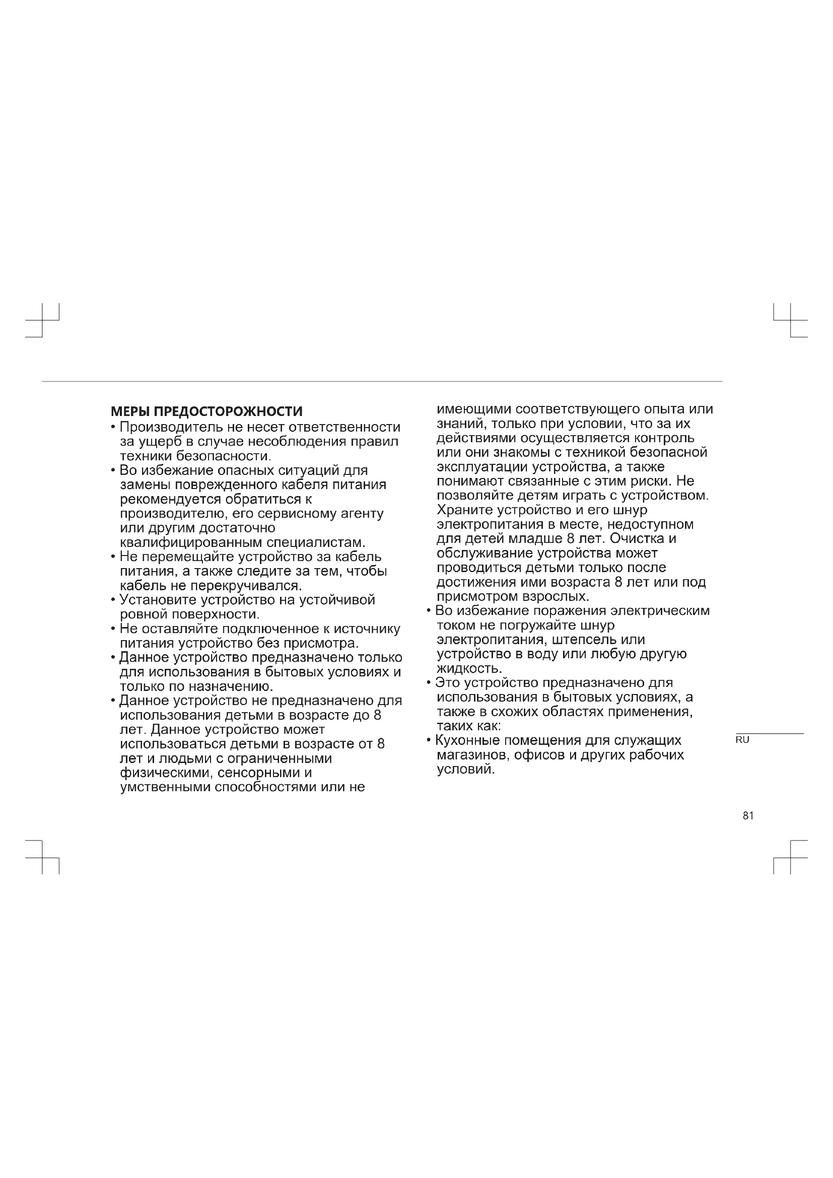 - Данное устройство не предназначено для использования детьми в возрасте до 8 лет. Данное устройство может использоваться детьми в возрасте от 8 лет и людьми с ограниченными физическими, сенсорными и умственными способностями или не имеющими соответствующего опыта или знаний, только при условии, что за их действиями осуществляется контроль или они знакомы с техникой безопасной эксплуатации устройства, а также понимают связанные с этим риски. Не позволяйте детям играть с устройством. Храните устройство и его шнур электропитания в месте, недоступном для детей младше 8 лет. Очистка и обслуживание устройства может проводиться детьми только после достижения ими возраста 8 лет или под присмотром взрослых.