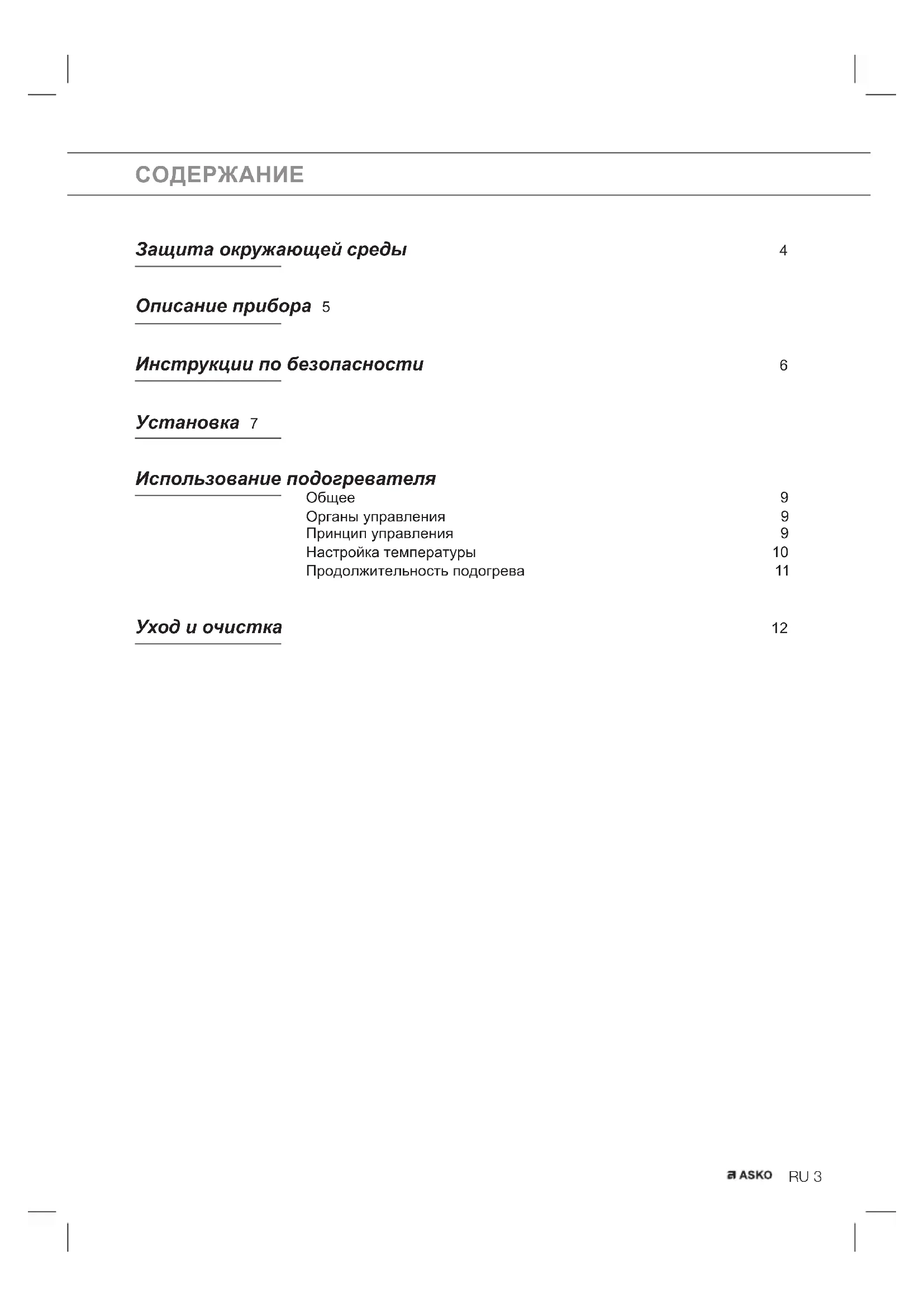 материал и толщина посуды; степень заполнения; распределение груза; настройка температуры. Поэтому невозможно привести конкретные данные. Некоторые данные: Продолжительность равномерного подогрева при установленной температуре 60 °C: Сервиз на 6 персон — примерно 30 минут. Сервиз на 12 персон — примерно 40 минут. Вы сами заметите, сколько времени требуется для подогрева вашей посуды.RU 12 УХОД И ОЧИСТКА Прежде чем приступить к очистке прибора, выключите его и дайте ему остыть. Производите очистку всех поверхностей прибора только с использованием влажной салфетки и мягкого моющего средства. Затем обсушите прибор мягкой салфеткой. Не используйте пароочиститель для очистки прибора. Не используйте абразивные средства, алкоголь или растворитель. При их использовании может произойти повреждение прибора. Передняя панель сделана из нержавеющей стали или стекла, поэтому она не защищена от нанесения царапин. Для очистки участков из нержавеющей стали применяйте специальное моющее средство, не содержащее абразивных веществ. Стеклянное дно можно очищать водой и моющим средством. Затем следует его полностью высушить. Установите дно в ящик только после того, как оно идеально просохнет. Импортер: ООО «Аско Бытовая техника» Россия, 119180, г. Москва Якиманская набережная, д. 4, стр. 1 тел. (495) 105-95-70 e-mail: info@askorus.ru cайт : www.askorus.ruKK 3