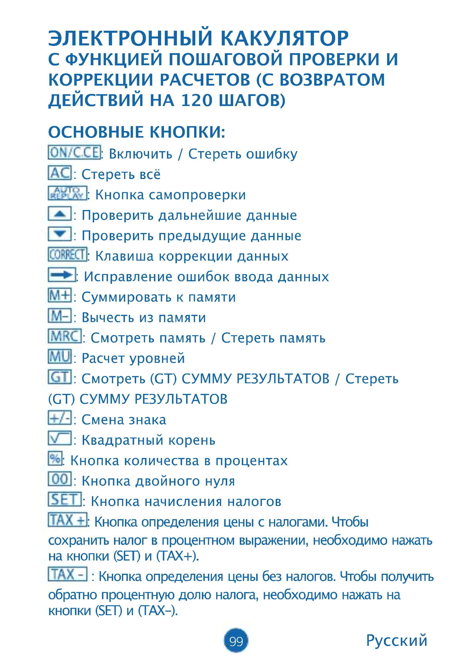 ЭЛЕКТРОННЫЙ КАКУЛЯТОР С ФУНКЦИЕЙ ПОШАГОВОЙ ПРОВЕРКИ И КОРРЕКЦИИ РАСЧЕТОВ (С ВОЗВРАТОМ ДЕЙСТВИЙ НА 120 ШАГОВ) ОСНОВНЫЕ КНОПКИ: : Включить / Стереть ошибку : Стереть всё : Кнопка самопроверки : Проверить дальнейшие данные : Проверить предыдущие данные : Клавиша коррекции данных : Исправление ошибок ввода данных : Суммировать к памяти : Вычесть из памяти : Смотреть память / Стереть память : Расчет уровней : Смотреть (GT) СУММУ РЕЗУЛЬТАТОВ / Стереть (GT) СУММУ РЕЗУЛЬТАТОВ : Смена знака : Квадратный корень : Кнопка количества в процентах : Кнопка двойного нуля : Кнопка начисления налогов : Кнопка определения цены с налогами. Чтобы сохранить налог в процентном выражении, необходимо нажать на кнопки (SET) и (TAX+). : Кнопка определения цены без налогов. Чтобы получить обратно процентную долю налога, необходимо нажать на кнопки (SET) и (TAX-).100 ОПИСАНИЕ ПЕРЕКЛЮЧАТЕЛЕЙ КАЛЬКУЛЯТОРА: