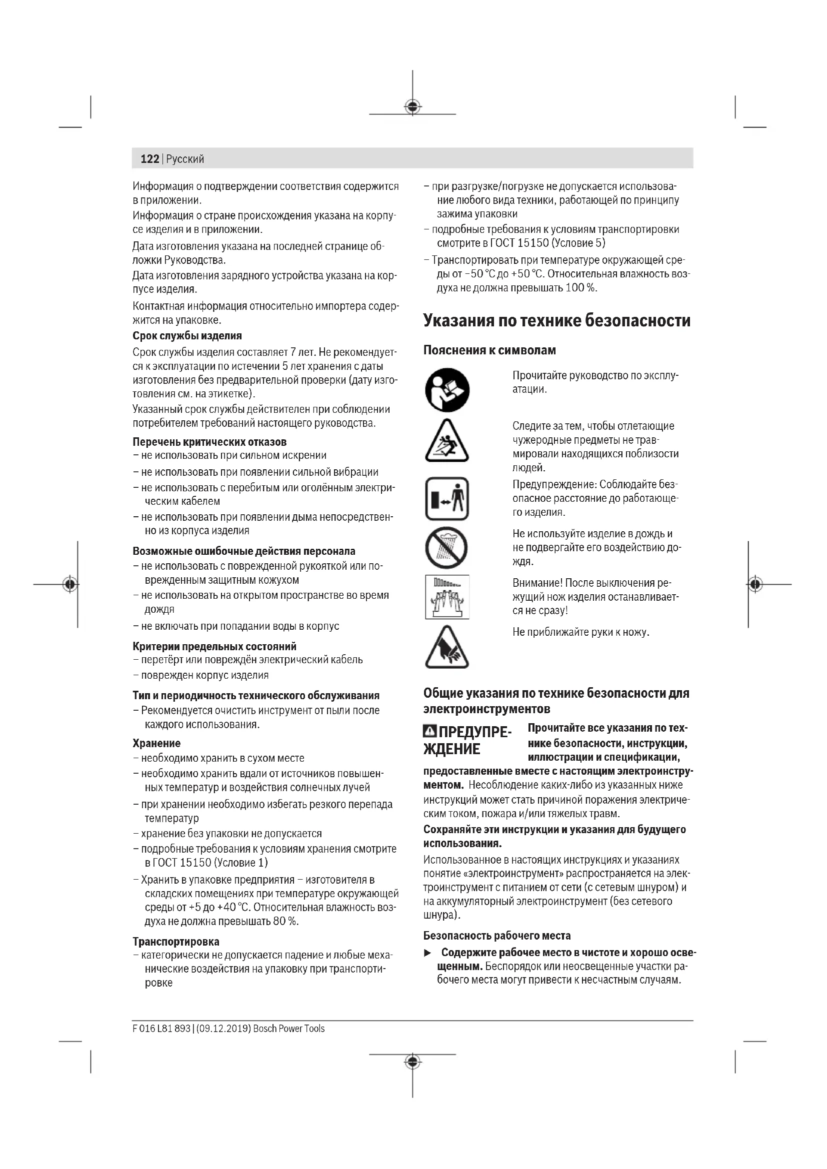 Toлько для стран Евразийского экономического союза (Таможенного союза) В состав эксплуатационных документов, предусмотрен- ных изготовителем для продукции, могут входить настоя- щее руководство по эксплуатации, а также приложения. Bosch Power Tools F 016 L81 893 | (09.12.2019)122 | Русский Информация о подтверждении соответствия содержится в приложении. Информация о стране происхождения указана на корпу- се изделия и в приложении. Дата изготовления указана на последней странице об- ложки Руководства. Дата изготовления зарядного устройства указана на кор- пусе изделия. Контактная информация относительно импортера содер- жится на упаковке. Срок службы изделия Срок службы изделия составляет 7 лет. Не рекомендует- ся к эксплуатации по истечении 5 лет хранения с даты изготовления без предварительной проверки (дату изго- товления см. на этикетке). Указанный срок службы действителен при соблюдении потребителем требований настоящего руководства. Перечень критических отказов – не использовать при сильном искрении – не использовать при появлении сильной вибрации – не использовать с перебитым или оголённым электри- ческим кабелем – не использовать при появлении дыма непосредствен- но из корпуса изделия Возможные ошибочные действия персонала – не использовать с поврежденной рукояткой или по- врежденным защитным кожухом – не использовать на открытом пространстве во время
