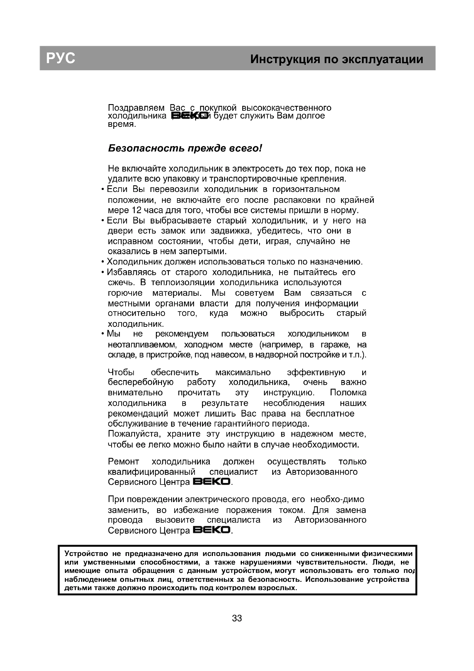 Устройство не предназначено для использования людьми со сниженными физическими или умственными способностями, а также нарушениями чувствительности. Люди, не имеющие опыта обращения с данным устройством, могут использовать его только под наблюдением опытных лиц, ответственных за безопасность. Использование устройства детьми также должно происходить под контролем взрослых.РУС Инструкция по эксплуатации Требования к электропитанию Перед тем, как вставить штепсель в электрическую розетку убедитесь, что напряжение и частота тока, указанные на заводской марке внутри холодильника, соответствуют напряжению и частоте тока в электросети вашего дома. Мы рекомендуем подключать холодильник к электросети через розетку, должным образом установленную в легко доступном