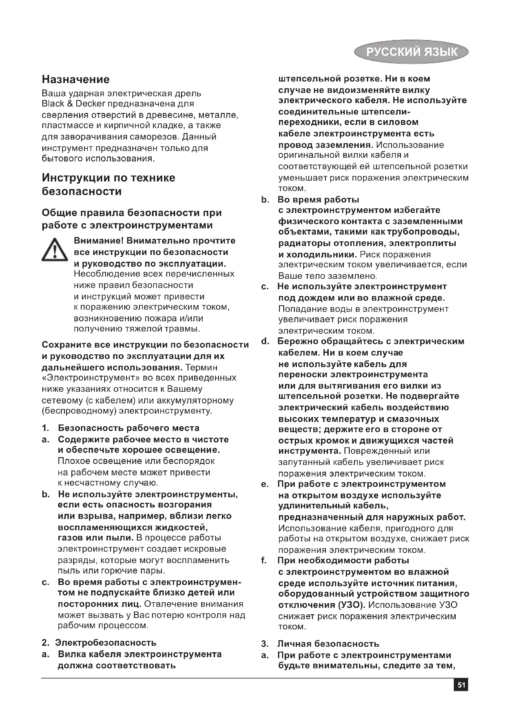 Ваша ударная электрическая дрель Black & Decker предназначена для сверления отверстий в древесине, металле, пластмассе и кирпичной кладке, а также для заворачивания саморезов. Данный инструмент предназначен только для бытового использования. Инструкции по технике безопасности Общие правила безопасности при работе с электроинструментами Внимание! Внимательно прочтите все инструкции по безопасности и руководство по эксплуатации. Несоблюдение всех перечисленных ниже правил безопасности и инструкций может привести к поражению электрическим током, возникновению пожара и/или получению тяжелой травмы. Сохраните все инструкции по безопасности и руководство по эксплуатации для их дальнейшего использования. Термин «Электроинструмент» во всех приведенных ниже указаниях относится к Вашему сетевому (с кабелем) или аккумуляторному (беспроводному) электроинструменту.