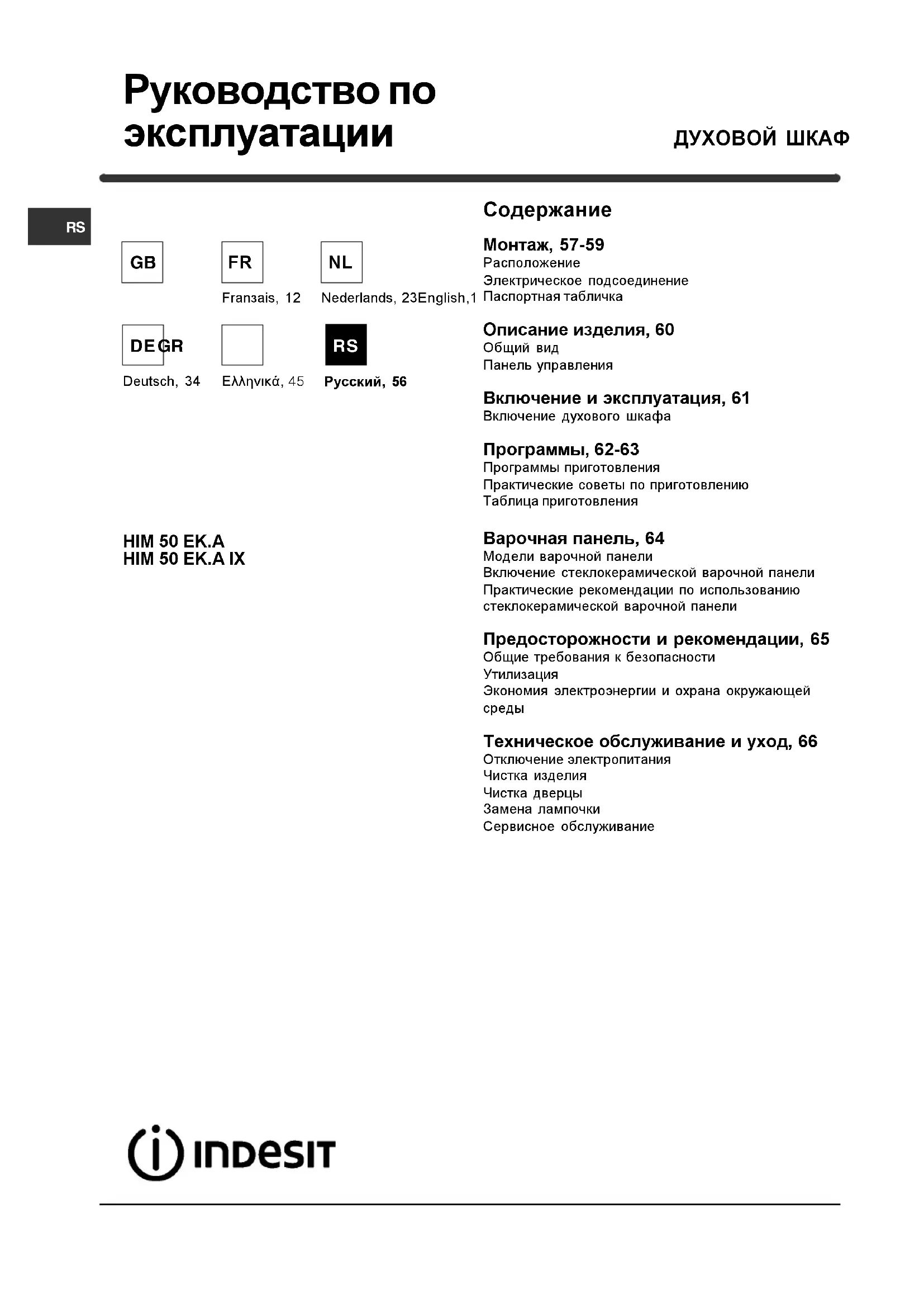РУКОВОДСТВО ПОЛЬЗОВАТЕЛЯ HIM 506 EK.A IX INDESIT