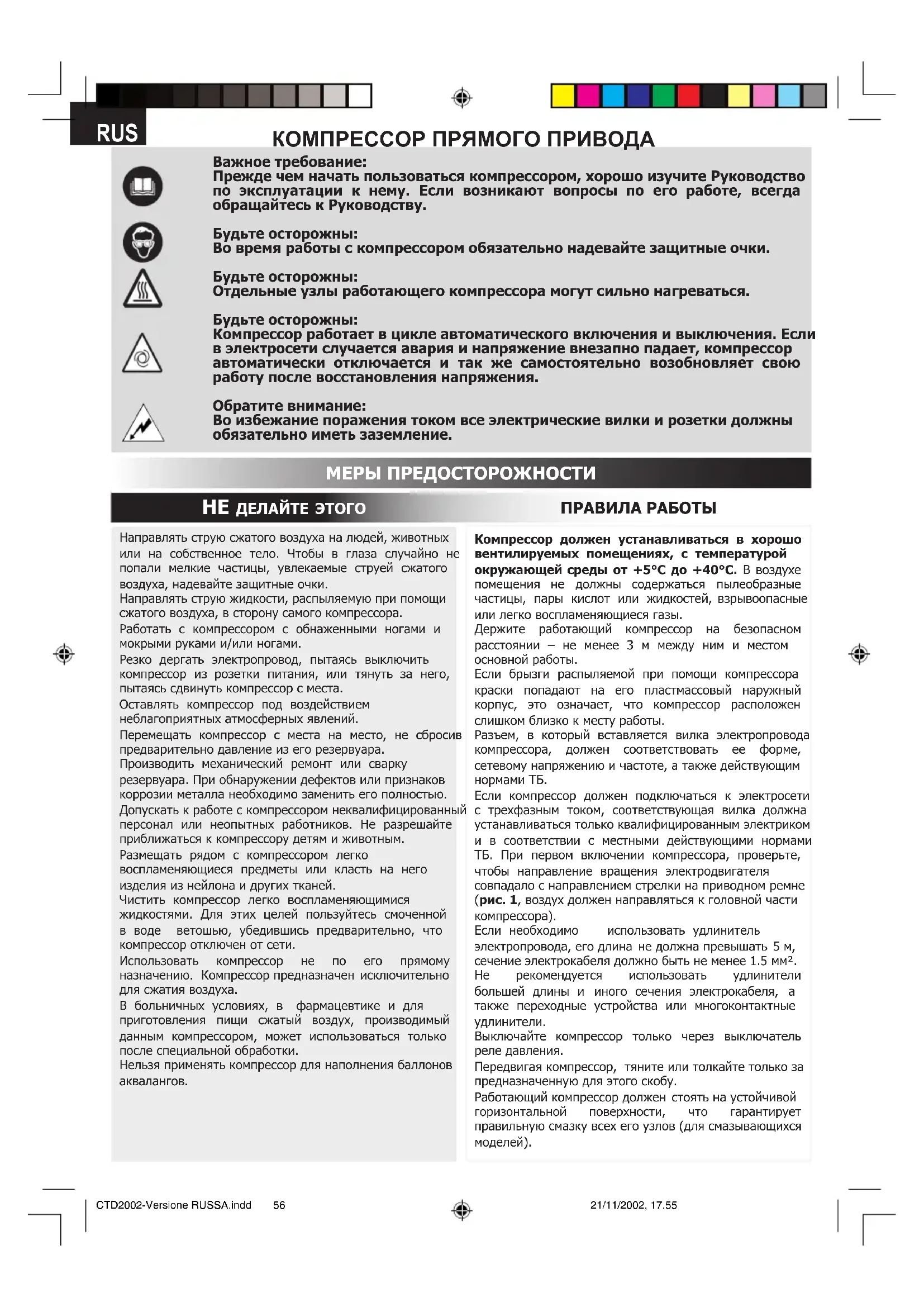 A RELATÍVNE ZÁSAHY, KTORÉ SÚ DOVOLENÉ Anomália Príčina Zákrok Unikanie vzduchu z ventilu presostatu pri kompresore vo vypnutej polohe.Zníženie výkonnosti. Časté spustenia sa chodu. Nízke tlakové hodnoty.Kompresor sa zastaví a po pár minútach sa rozbehne sám od seba.Pri verziách “V” a 3 HP sa nerozbehne. Kompresor sa zastaví po niekoľkých pokusoch o rozbehnutie sa.Spätný ventil, ktorý z dôvodu opotrebovania alebo znečistenia v tesniacej drážke, nevykonáva správne svoju funkciu. Príliš veľká požiadavka na výkonnosť alebo vyskytnutie sa prípadného unikania zo spojov a/alebo potrubí. Je možné, že sa jedná aj o upchatie nasávacieho ltru. V dôsledku zasiahnutia tepelných ochrán dochádza k prehriatiu motora. V dôsledku zasiahnutia tepelnej ochrany dochádza k prehriatiu motora (vypojenie vidlice počas chodu, nedostatočné napájacie napätie stroja). Odskrutkujte šesťhrannú hlavu spätného ventilu, vyčistite sedlo a disk zo špeciálnej gumy (ak je opotrebovaný, vymeňte ho). Zaskrutkujte a dôsledne utiahnite ventil (obr.č. 14a, 14b). Vymeňte tesnenia v spojoch. Vyčistite alebo vymeňte lter.Očistite vzduchové prechody na dopravníku. Vyvetrajte miestnosť. Znovu uveďte do chodu tepelnú poistku. Pri modeloch s mazaním a “V” modeloch skontrolujte hladinu a kvalitu oleja. Pri “V” modeloch skontrolujte elektrické napätie. Uveďte do činnosti vypnutý vypínač chodu prevádzky. Vyvetrajte miestnosť. Počkajte niekoľko minút a kompresor sa autonomaticky znova uvedie do chodu. Pri modeloch “V” a 3 HP sa doporučuje, znovu uviesť do chodu tepelnú poistku. Odstráňte prípadné predlžovačky napájacieho káblu. Kompresor sa nezastaví a zasiahne poistný ventil.Nesprávne fungovanie kompresora alebo pretrhnutie, prerušenie presostatu.Odpojte vidlicu, zástrčku a obráťte sa na servisné stredisko. CTD2002-Versione SLOVACCA.indd 21/11/2002, 17.5555I RUS Важное требование:Прежде чем начать пользоваться компрессором, хорошо изучите Руководство по эксплуатации к нему. Если возникают вопросы по его работе, всегда обращайтесь к Руководству.Будьте осторожны:Во время работы с компрессором обязательно надевайте защитные очки.Будьте осторожны:Отдельные узлы работающего компрессора могут сильно нагреваться.Будьте осторожны:Компрессор работает в цикле автоматического включения и выключения. Если в электросети случается авария и напряжение внезапно падает, компрессор автоматически отключается и так же самостоятельно возобновляет свою работу после восстановления напряжения.Обратите внимание:Во избежание поражения током все электрические вилки и розетки должны обязательно иметь заземление. МЕРЫ ПРЕДОСТОРОЖНОСТИ Направлять струю сжатого воздуха на людей, животных или на собственное тело. Чтобы в глаза случайно не попали мелкие частицы, увлекаемые струей сжатого воздуха, надевайте защитные очки.Направлять струю жидкости, распыляемую при помощи сжатого воздуха, в сторону самого компрессора.Работать с компрессором с обнаженными ногами и мокрыми руками и/или ногами.Резко дергать электропровод, пытаясь выключить компрессор из розетки питания, или тянуть за него, пытаясь сдвинуть компрессор с места.Оставлять компрессор под воздействием неблагоприятных атмосферных явлений.Перемещать компрессор с места на место, не сбросив предварительно давление из его резервуара.Производить механический ремонт или сварку резервуара. При обнаружении дефектов или признаков коррозии металла необходимо заменить его полностью.Допускать к работе с компрессором неквалифицированный персонал или неопытных работников. Не разрешайте приближаться к компрессору детям и животным. Размещать рядом с компрессором легко воспламеняющиеся предметы или класть на него изделия из нейлона и других тканей.Чистить компрессор легко воспламеняющимися жидкостями. Для этих целей пользуйтесь смоченной в воде ветошью, убедившись предварительно, что компрессор отключен от сети. Использовать компрессор не по его прямому назначению. Компрессор предназначен исключительно для сжатия воздуха.В больничных условиях, в фармацевтике и для приготовления п