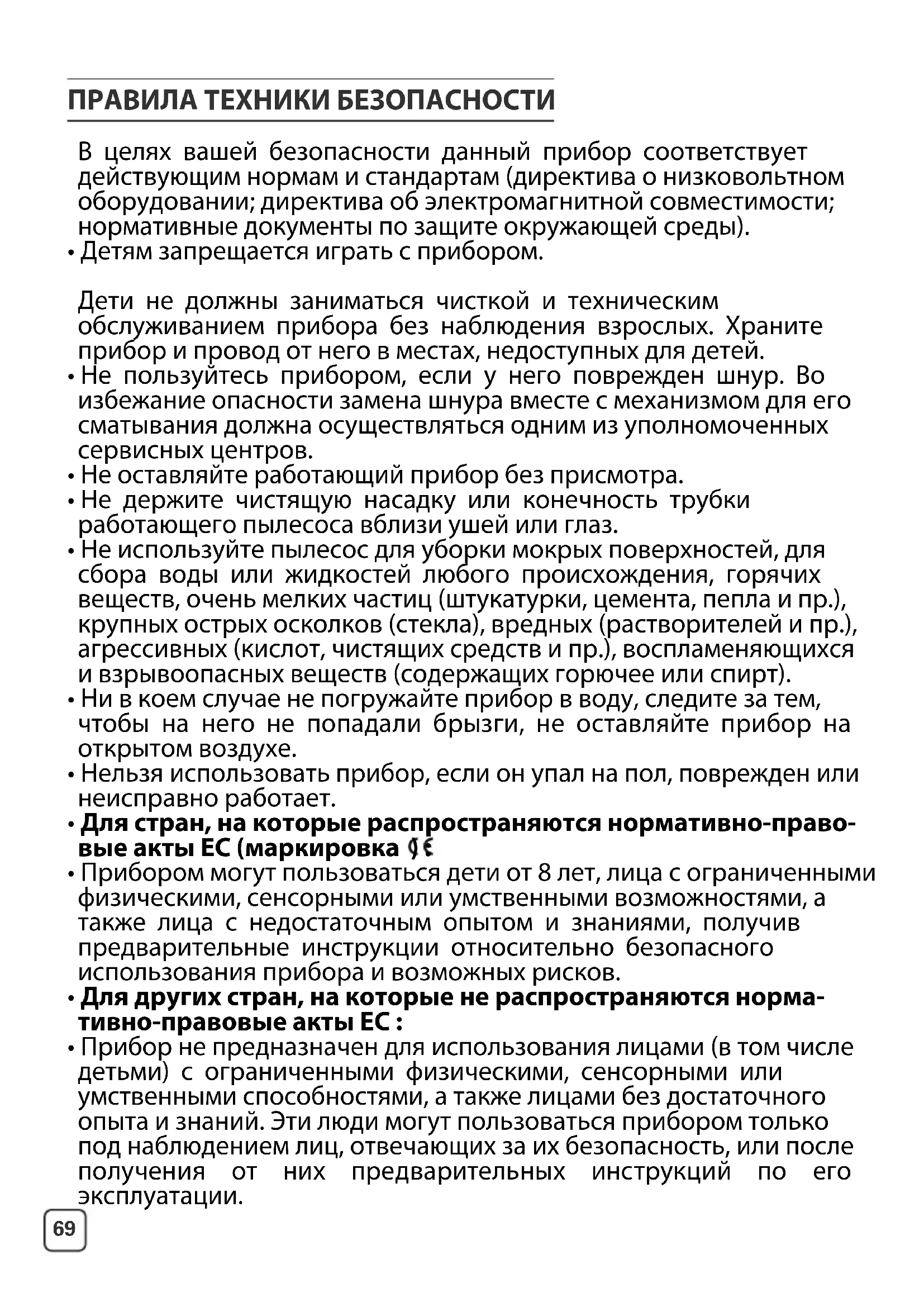 - Прибор предназначен исключительно для использования в хозяйственно-бытовых целях; производительне несет никакой ответственности, а гарантия теряет свою силу в случае использования прибора не поназначению или не в соответствии с инструкцией по эксплуатации.• Внимательно прочитайте инструкцию перед первым использованием прибора и сохраните ее.Использование, противоречащее инструкции, освобождает производителя от какой бы то ни былоответственности. SM_LEAFLET CDS ASPIRATEUR_EUROPE_2220001042-01.qxp_EUROPE 03/05/2017 12:07 Page6869 ПРАВИЛА ТЕХНИКИ БЕЗОПАСНОСТИ В целях вашей безопасности данный прибор соответствует действующим нормам и стандартам (директива о низковольтном оборудовании; директива об электромагнитной совместимости; нормативные документы по защите окружающей среды).