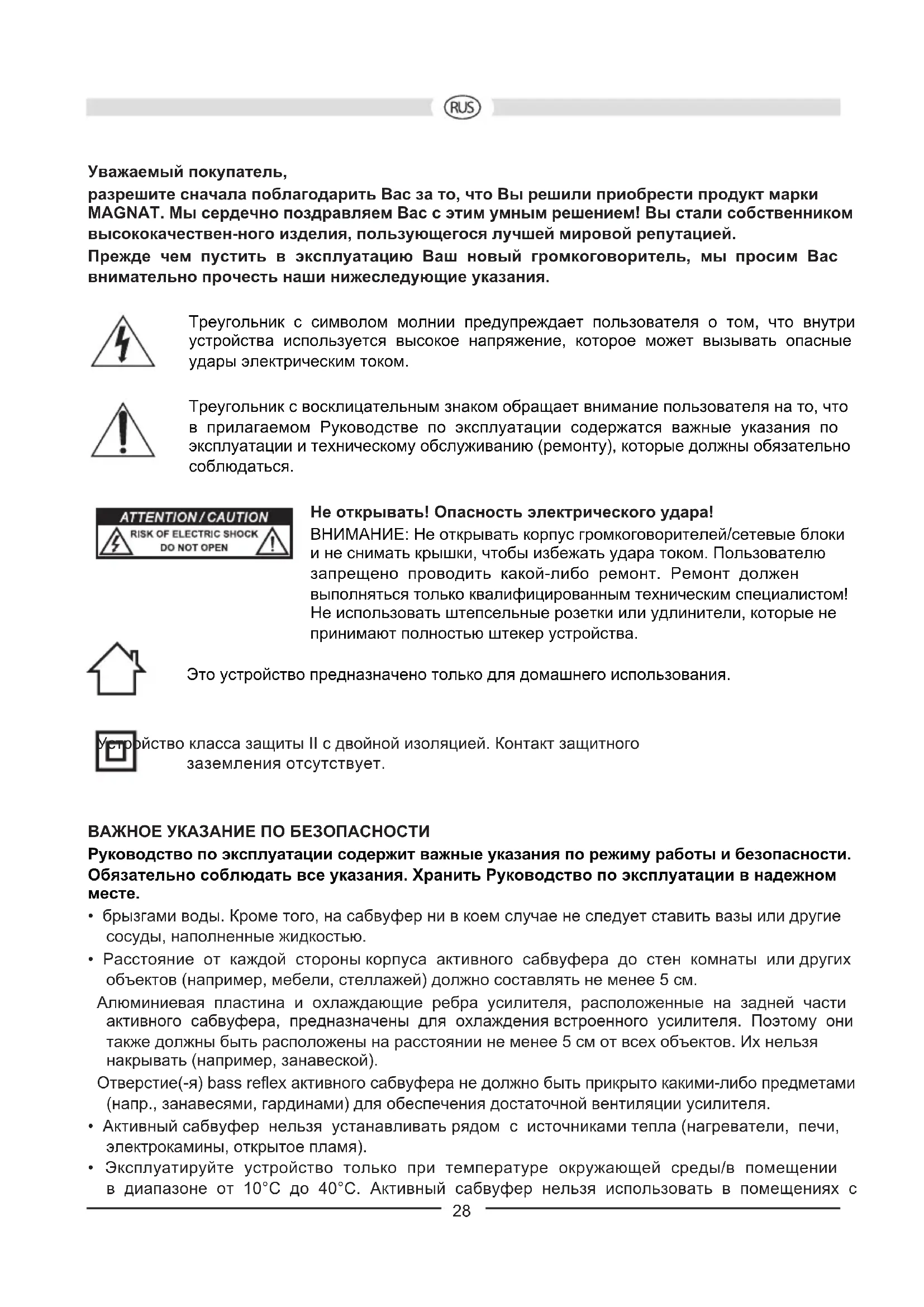 Fördelningsfrekvenskontroll (4) Härmed bör du ställa in den högsta frekvensen som subwoofern kan arbeta med. I kombination med hyllhögtalare bör frekvensen ställas in på 40 Hz – 120 Hz, om stående högtalare används kan en inställning mellan 50 Hz – 100 Hz rekommenderas. Fasreglering (3) I normalfall ska fasregleringen stå på 0°. I vissa fall kan det vara lämpligt att variera fasen mellan 0° och 180° (t ex vid långt avstånd mellan subwoofern och front-satelliterna eller vid dålig akustik i rummet). Generellt gäller: Fasomkopplaren står i rätt läge när grundtonen låter mest naturlig. SKÖTSEL Torka av ytorna med ett rengöringsmedel för hushållsbruk, använd alltså aldrig möbelpolish eller liknande. TEKNISKA DATA Konfiguration: Basreflex subwoofer, ’Frontfire’ Bestyckning: Drivsteg för 30 cm lång slaglängd Utgångseffekt RMS/Max.: 140 / 280 W Frekvensområde: 20 – 200 Hz Delningsfrekvens: 40 – 120 Hz inställbar Mått (BxHxD): 355 x 475 x 435 mm Tillbehör: Nätkabel VI FÖRBEHÅLLER OSS RÄTTEN TILL TEKNISKA ÄNDRINGAR.28 Уважаемый покупатель, разрешите сначала поблагодарить Вас за то, что Вы решили приобрести продукт марки MAGNAT. Мы сердечно поздравляем Вас с этим умным решением! Вы стали собственником высококачествен-ного изделия, пользующегося лучшей мировой репутацией. Прежде чем пустить в эксплуатацию Ваш новый громкоговоритель, мы просим Вас внимательно прочесть наши нижеследующие указания. Треугольник с символом молнии предупреждает пользователя о том, что внутри устройства используется высокое напряжение, которое может вызывать опасные удары электрическим током. Треугольник с восклицательным знаком обращает внимание пользователя на то, что в прилагаемом Руководстве по эксплуатации содержатся важные указания по эксплуатации и техническому обслуживанию (ремонту), которые должны обязательно соблюдаться. Не открывать! Опасность электрического удара! ВНИМАНИЕ: Не открывать корпус громкоговорителей/сетевые блоки и не снимать крышки, чтобы избежать удара током. Пользователю запрещено проводить какой-либо ремонт. Ремонт должен выполняться только квалифицированным техническим специалистом! Не использовать штепсельные розетки или удлинители, которые не принимают полностью штекер устройства. Это устройство предназначено только для домашнего использования. Устройство класса защиты II с двойной изоляцией. Контакт защитного заземления отсутствует. ВАЖНОЕ УКАЗАНИЕ ПО БЕЗОПАСНОСТИ Руководство по эксплуатации содержит важные указания по режиму работы и безопасности. Обязательно соблюдать все указания. Хранить Руководство по эксплуатации в надежном