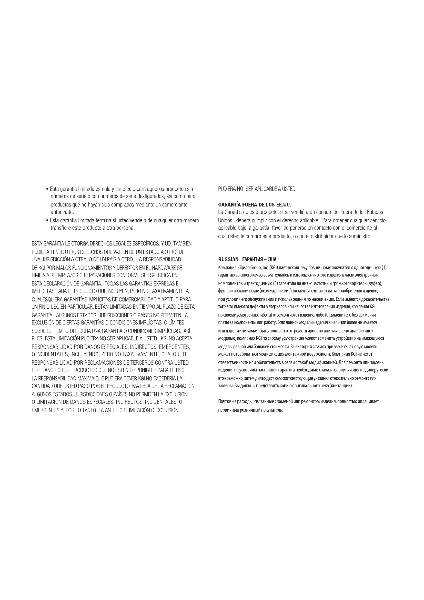 - Esta garantía limitada termina si usted vende o de cualquier otra manera transfiere este producto a otra persona. ESTA GARANTÍA LE OTORGA DERECHOS LEGALES ESPECÍFICOS, Y UD. TAMBIÉN PUDIERA TENER OTROS DERECHOS QUE VARÍEN DE UN ESTADO A OTRO, DE UNA JURISDICCIÓN A OTRA, O DE UN PAÍS A OTRO. LA RESPONSABILIDAD DE KGI POR MALOS FUNCIONAMIENTOS Y DEFECTOS EN EL HARDWARE SE LIMITA A REEMPLAZOS O REPARACIONES CONFORME SE ESPECIFICA EN ESTA DECLARACIÓN DE GARANTÍA. TODAS LAS GARANTÍAS EXPRESAS E IMPLÍCITAS PARA EL PRODUCTO QUE INCLUYEN, PERO NO TAXATIVAMENTE, A CUALESQUIERA GARANTÍAS IMPLÍCITAS DE COMERCIABILIDAD Y APTITUD PARA UN FIN O USO EN PARTICULAR, ESTÁN LIMITADAS EN TIEMPO AL PLAZO DE ESTA GARANTÍA. ALGUNOS ESTADOS, JURISDICCIONES O PAÍSES NO PERMITEN LA EXCLUSIÓN DE CIERTAS GARANTÍAS O CONDICIONES IMPLÍCITAS, O LÍMITES SOBRE EL TIEMPO QUE DURA UNA GARANTÍA O CONDICIONES IMPLÍCITAS. ASÍ PUES, ESTA LIMITACIÓN PUDIERA NO SER APLICABLE A USTED. KGI NO ACEPTA RESPONSABILIDAD POR DAÑOS ESPECIALES, INDIRECTOS, EMERGENTES, O INCIDENTALES, INCLUYENDO, PERO NO TAXATIVAMENTE, CUALQUIER RESPONSABILIDAD POR RECLAMACIONES DE TERCEROS CONTRA USTED POR DAÑOS O POR PRODUCTOS QUE NO ESTÉN DISPONIBLES PARA EL USO. LA RESPONSABILIDAD MÁXIMA QUE PUDIERA TENER KGI NO EXCEDERÍA LA CANTIDAD QUE USTED PAGÓ POR EL PRODUCTO MATERIA DE LA RECLAMACIÓN. ALGUNOS ESTADOS, JURISDICCIONES O PAÍSES NO PERMITEN LA EXCLUSIÓN O LIMITACIÓN DE DAÑOS ESPECIALES, INDIRECTOS, INCIDENTALES O EMERGENTES Y, POR LO TANTO, LA ANTERIOR LIMITACIÓN O EXCLUSIÓN PUDIERA NO SER APLICABLE A USTED. GARANTÍA FUERA DE LOS EE.UU. La Garantía de este producto, si se vendió a un consumidor fuera de los Estados Unidos, deberá cumplir con el derecho aplicable. Para obtener cualquier servicio aplicable bajo la garantía, favor de ponerse en contacto con el comerciante al cual usted le compró este producto, o con el distribuidor que lo suministró. RUSSIAN - ГАРАНТИЯ – США Компания Klipsch Group, Inc, (KGI) дает исходному розничному покупателю одногодичную(1) гарантию высокого качества материалов и изготовления этого изделия в части элек тронных компонентов и трехгодичную (3) гарантию на низкочастотный громкоговоритель (вуфер), футляр и механические (неэлектрические) элементы, считая от даты приобретения изделия, при условии его обслуживания и использования по назначению. Если имеются доказательства того, что имеются дефекты материалов или качес тва изготовления изделия, компания KGI по своему усмотрению либо (а) отремонтирует изделие, либо (б) заменит его без взимания платы за компоненты или работу. Если данной модели изделия в наличии более не имеется или изделие не может быть полностью отремонтировано или заменено аналогичной моделью, компания KGI по своему усмотрению может заменить устройство на имеющуюся модель, равной или большей стоимос ти. В некоторых случаях при замене на новую модель может потребоваться модификация монтажной поверхности. Компания KGI не несет ответственности или обязательств в связи с такой модификацией. Для ремонта или замены изделия по условиям настоящей гарантии необходимо сначала вернуть изделие дилеру, если это возможно, затем дилер даст вам соответствующие указания относительно ремонта или замены. Вы должны представить копию оригинального чека (квитанции). Почтовые расходы, связанные с заменой или ремонтом изделия, полностью оплачивает первичный розничный покупатель.ОГРАНИЧЕНИЯ.