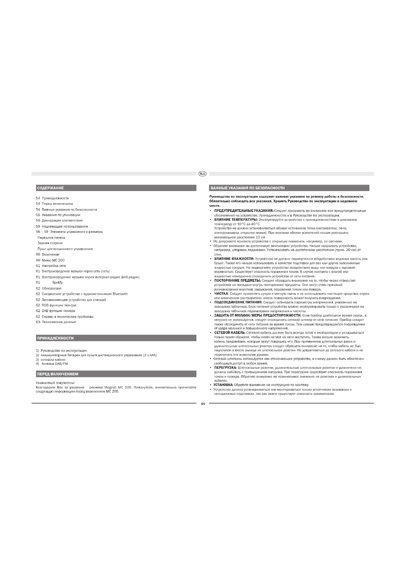 54 Принадлежности 54 Перед включением 54 Важные указания по безопасности 55 Указания по утилизации 55 Декларация соответствия 55 Надлежащее использование 56 – 59 Элементы управления и разъемы Передняя панель Задняя сторона Пульт дистанционного управления 60 Включение 60 Меню MC 200 61 Настройка сети 61 Воспроизведение музыки через сеть (сеть) 61 Воспроизведение музыки через интернет-радио (веб-радио) 61 Spotify 62 Обновление 62 Соединение устройства с аудиоисточником Bluetooth 62 Запоминающее устройство для станций 62 RDS функции тюнера 62 DAB функции тюнера 62 Сервис и технические проблемы 63 Технические данные ПРИНАДЛЕЖНОСТИ