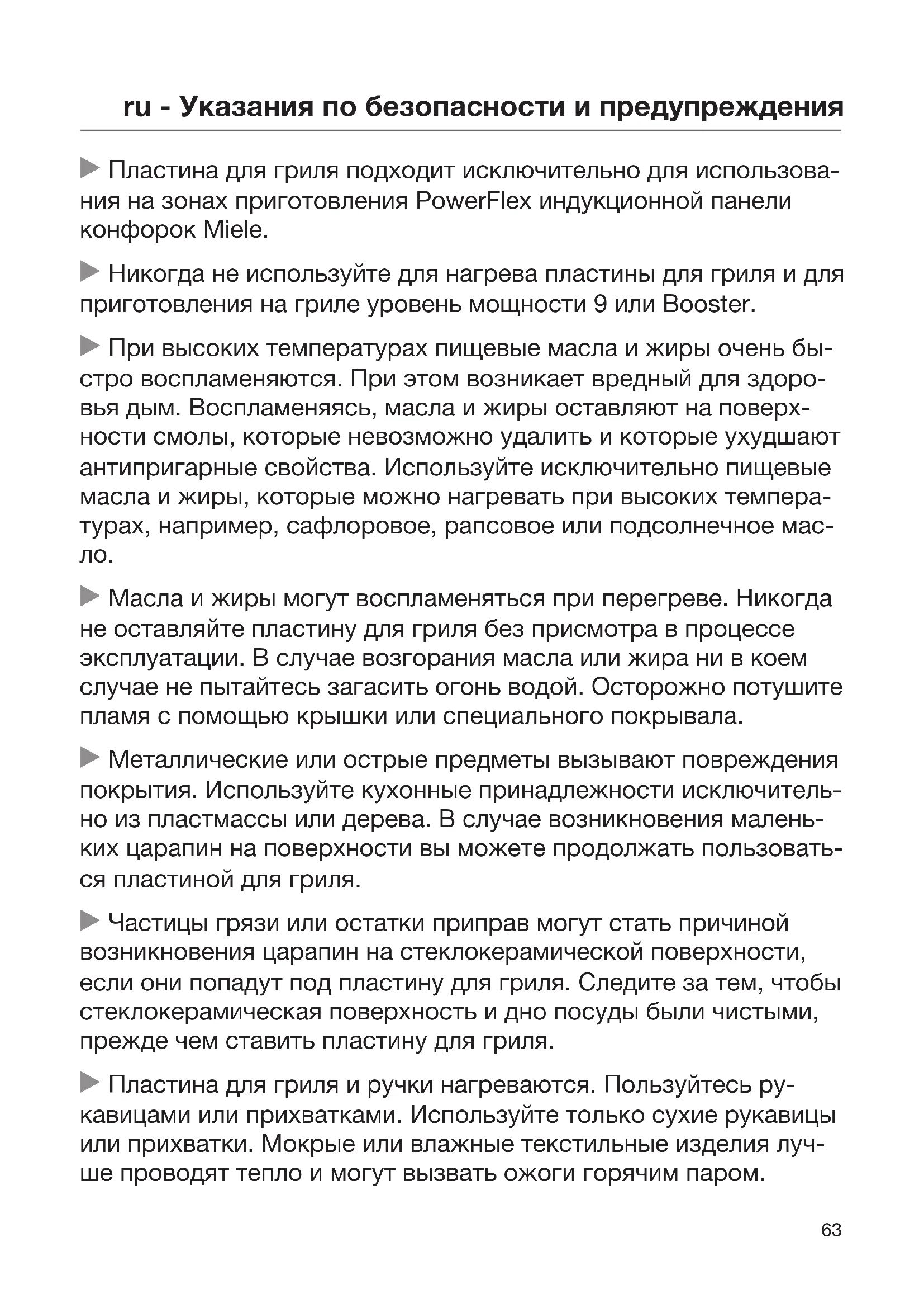 Пластина для гриля подходит исключительно для использова- ния на зонах приготовления PowerFlex индукционной панели конфорок Miele. Никогда не используйте для нагрева пластины для гриля и для приготовления на гриле уровень мощности 9 или Booster. При высоких температурах пищевые масла и жиры очень бы- стро воспламеняются. При этом возникает вредный для здоро- вья дым. Воспламеняясь, масла и жиры оставляют на поверх- ности смолы, которые невозможно удалить и которые ухудшают антипригарные свойства. Используйте исключительно пищевые масла и жиры, которые можно нагревать при высоких темпера- турах, например, сафлоровое, рапсовое или подсолнечное мас-