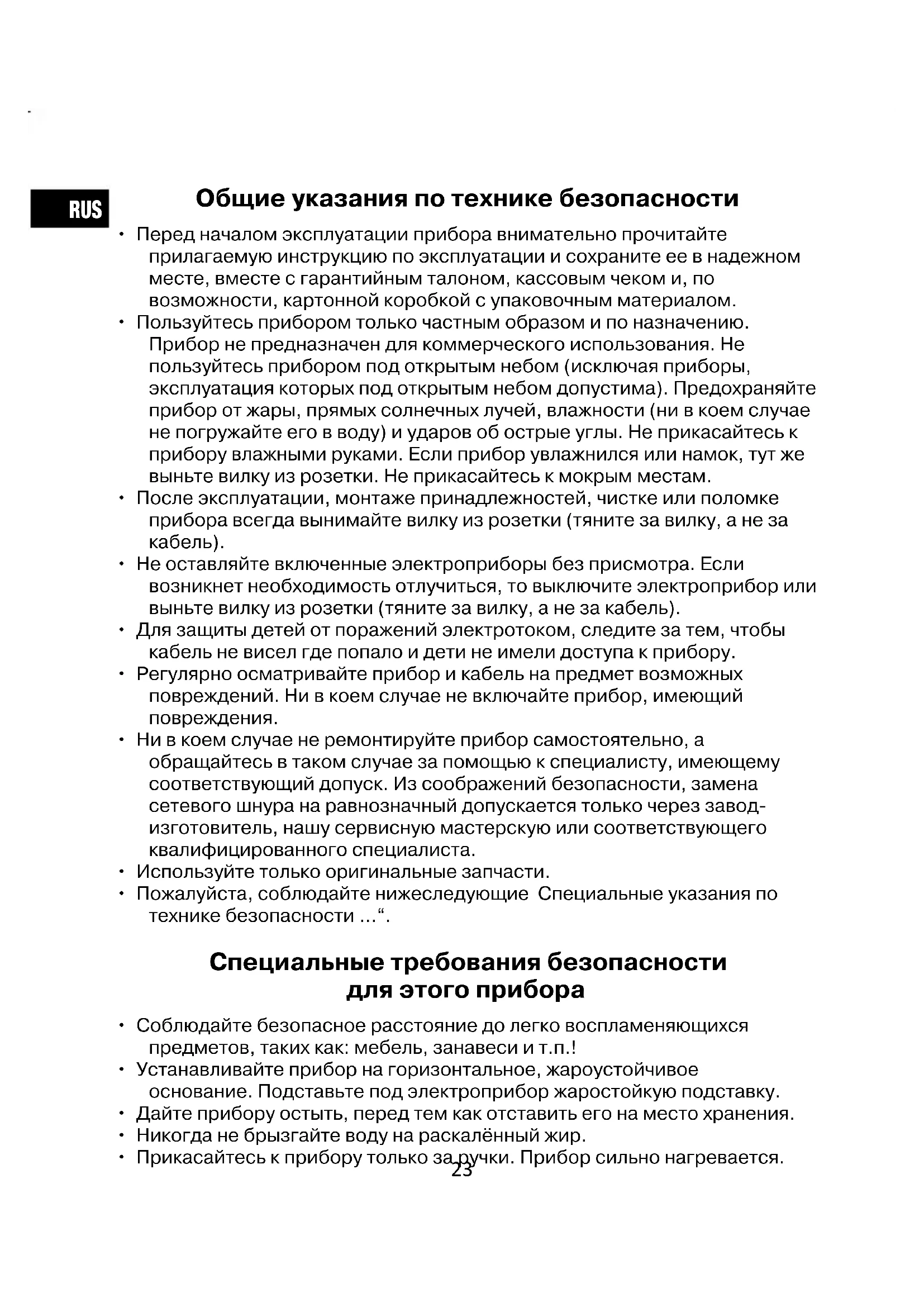 - Прикасайтесь к прибору только за ручки. Прибор сильно нагревается. 23RUS