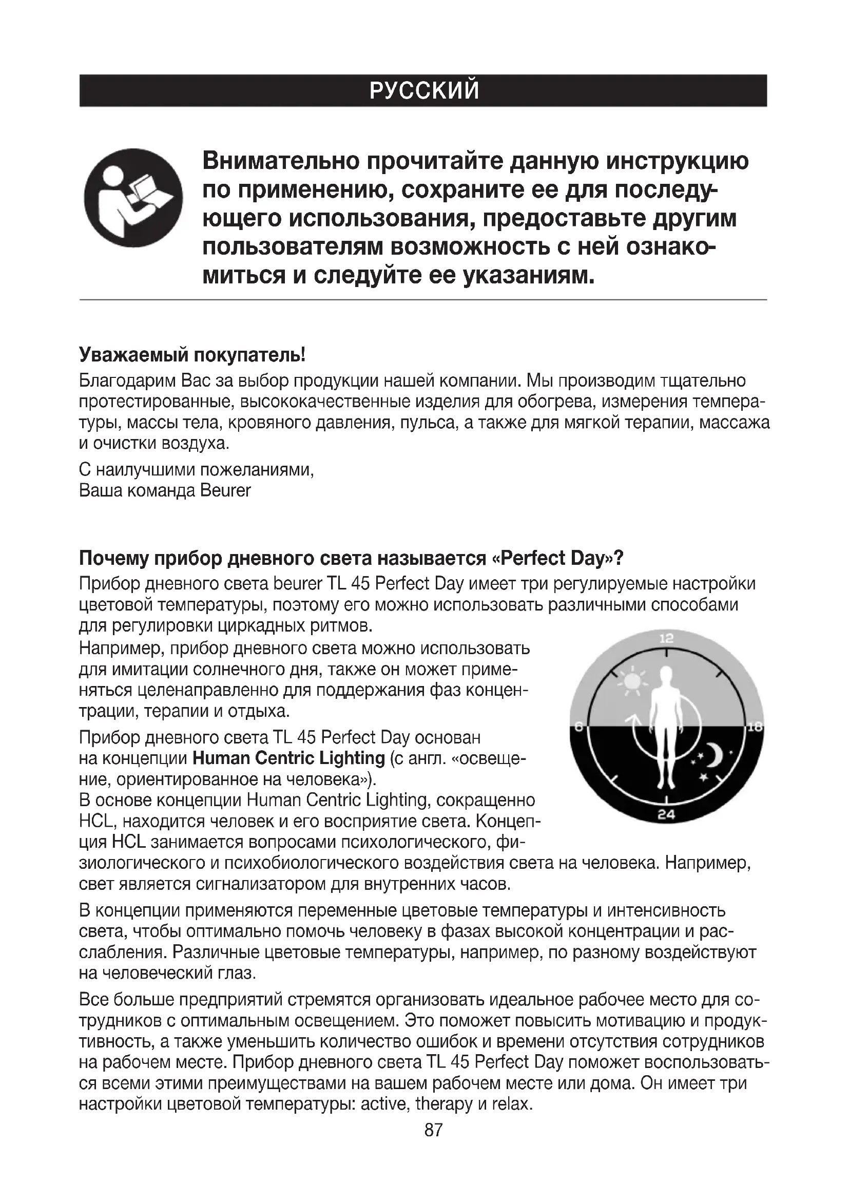 миться иследуйте ееуказаниям. Уважаемый покупатель! Благодарим Вас завыбор продукции нашей компании. Мыпроизводим тщательно протестированные, высококачественные изделия для обогрева, измерения темпера- туры, массы тела, кровяного давления, пульса, атакже для мягкой терапии, массажа иочистки воздуха. Снаилучшими пожеланиями, Ваша команда Beurer Почему прибор дневного света называется «Perfect Day»? Прибор дневного света beurer TL45 PerfectDay имеет три регулируемые настройки цветовой температуры, поэтому его можно использовать различными способами для регулировки циркадных ритмов. Например, прибор дневного света можно использовать для имитации солнечного дня, также онможет приме- няться целенаправленно для поддержания фаз концен- трации, терапии иотдыха. Прибор дневного света TL45PerfectDay основан наконцепции Human Centric Lighting (сангл. «освеще- ние, ориентированное начеловека»). Воснове концепции Human Centric Lighting, сокращенно HCL, находится человек иего восприятие света. Концеп- ция HCL занимается вопросами психологического, фи- зиологического ипсихобиологического воздействия света начеловека. Например, свет является сигнализатором для внутренних часов. Вконцепции применяются переменные цветовые температуры иинтенсивность света, чтобы оптимально помочь человеку вфазах высокой концентрации ирас- слабления. Различные цветовые температуры, например, поразному воздействуют начеловеческий глаз. Все больше предприятий стремятся организовать идеальное рабочее место для со- трудников соптимальным освещением. Это поможет повысить мотивацию ипродук- тивность, атакже уменьшить количество ошибок ивремени отсутствия сотрудников нарабочем месте. Прибор дневного света TL45PerfectDay поможет воспользовать- ся всеми этими преимуществами навашем рабочем месте или дома. Онимеет три настройки цветовой температуры: active, therapy иrelax.88 active therapy relax
