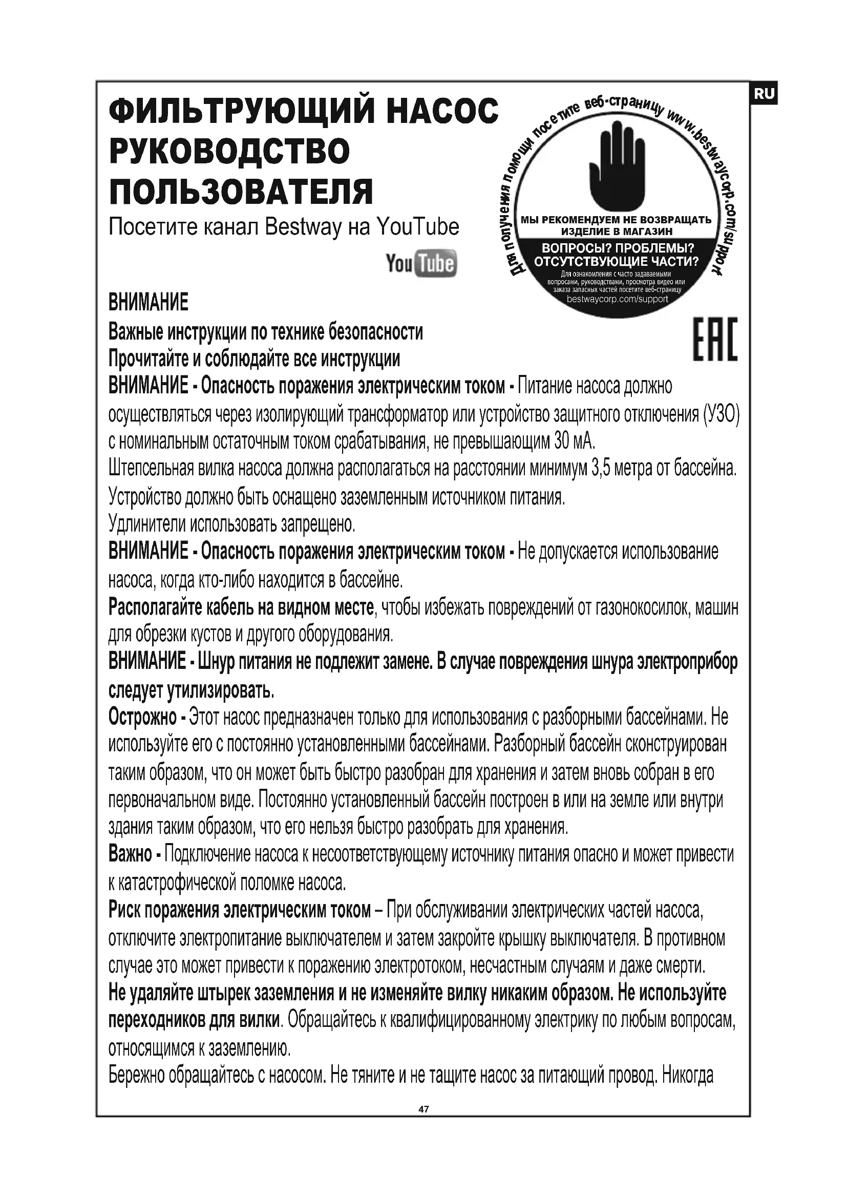 - когда вы уезжаете в отпуск или оставляете изделие без присмотра. Храните эту инструкцию в надежном месте. Сверяйтесь с ней каждый раз, разбирая бассейн. В случае утери инструкции обратитесь в компанию Bestway или на веб-сайт: www.bestwaycorp.com Примечание: Это изделие не предназначено для коммерческого применения. Внимательно изучите инструкции и сохраните их для дальнейшего использования в справочных целях. Сохраните эти инструкции. ФИЛЬТРУЮЩИЙ НАСОС РУКОВОДСТВО ПОЛЬЗОВАТЕЛЯ Посетите канал Bestway на YouTube МЫ РЕКОМЕНДУЕМ НЕ ВОЗВРАЩАТЬИЗДЕЛИЕ В МАГАЗИНВОПРОСЫ? ПРОБЛЕМЫ?ОТСУТСТВУЮЩИЕ ЧАСТИ? Для ознакомления с часто задаваемыми вопросами, руководствами, просмотра видео или заказа запасных частей посетите веб-страницу bestwaycorp.com/support