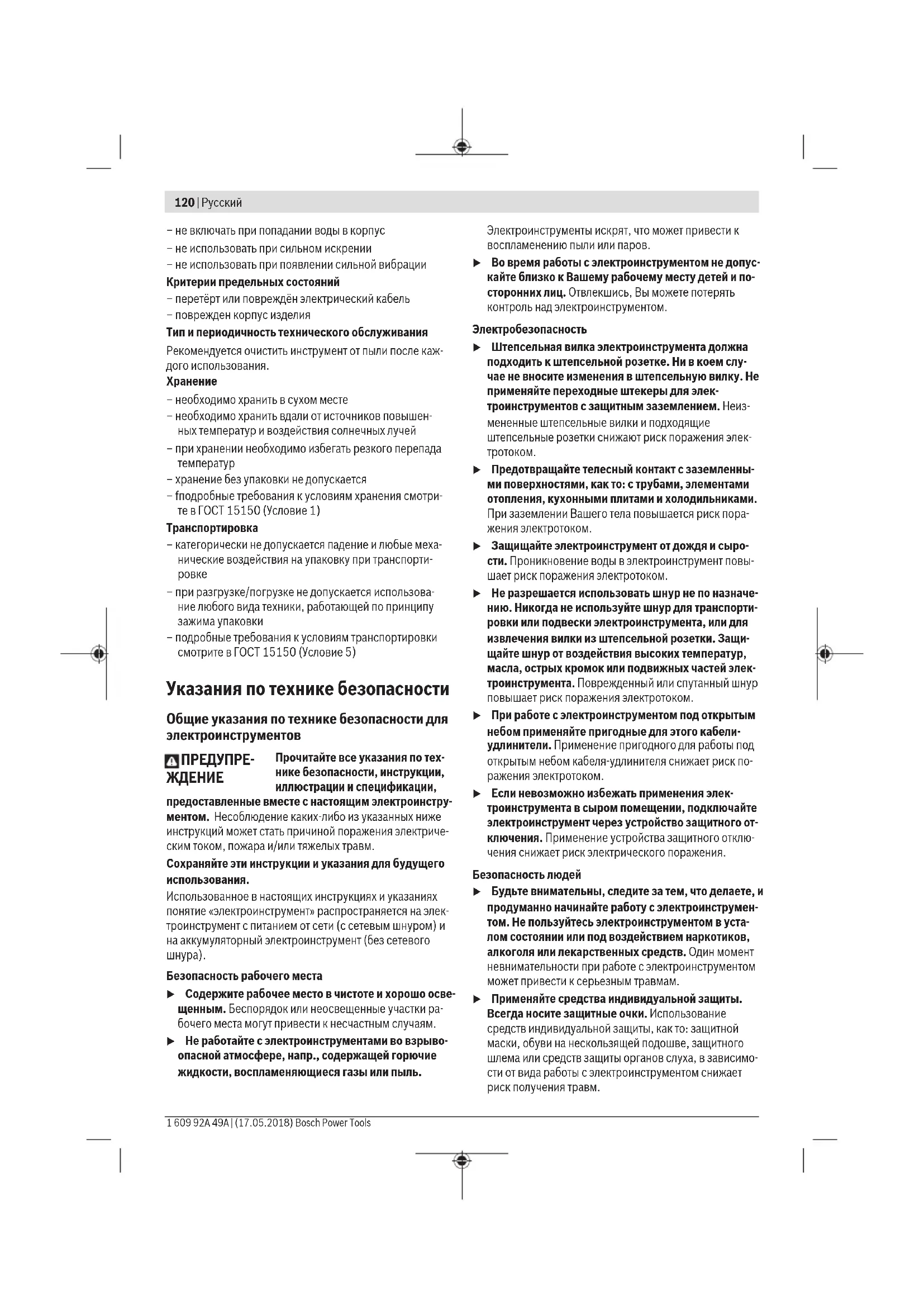 Toлько для стран Евразийского экономического союза (Таможенного союза) В состав эксплуатационных документов, предусмотрен- ных изготовителем для продукции, могут входить настоя- щее руководство по эксплуатации, а также приложения. Информация о подтверждении соответствия содержится в приложении. Информация о стране происхождения указана на корпу- се изделия и в приложении. Дата изготовления указана на последней странице об- ложки Руководства. Контактная информация относительно импортера содер- жится на упаковке. Срок службы изделия Срок службы изделия составляет 7 лет. Не рекомендует- ся к эксплуатации по истечении 5 лет хранения с даты изготовления без предварительной проверки (дату изго- товления см. на этикетке). Перечень критических отказов и ошибочные дей- ствия персонала или пользователя – не использовать с поврежденной рукояткой или по- врежденным защитным кожухом – не использовать при появлении дыма непосредствен- но из корпуса изделия – не использовать с перебитым или оголенным электри- ческим кабелем – не использовать на открытом пространстве во время дождя (в распыляемой воде) Русский | 119 Bosch Power Tools 1 609 92A 49A | (17.05.2018)120 | Русский 1 609 92A 49A | (17.05.2018) Bosch Power Tools – не включать при попадании воды в корпус – не использовать при сильном искрении – не использовать при появлении сильной вибрации Критерии предельных состояний – перетёрт или повреждён электрический кабель – поврежден корпус изделия Тип и периодичность технического обслуживания Рекомендуется очистить инструмент от пыли после каж- дого использования.