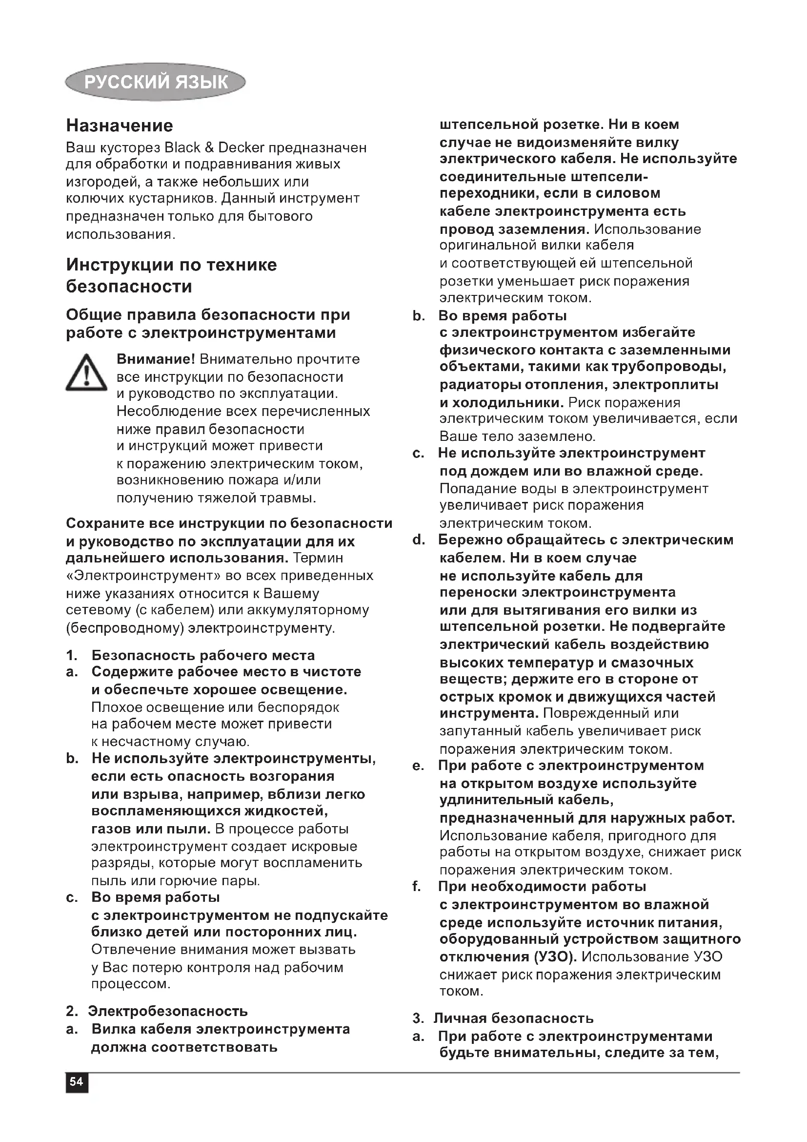 Ваш кусторез Black & Decker предназначен для обработки и подравнивания живых изгородей, а также небольших или колючих кустарников. Данный инструмент предназначен только для бытового использования. Инструкции по технике безопасности Общие правила безопасности при работе с электроинструментами Внимание! Внимательно прочтите все инструкции по безопасности и руководство по эксплуатации. Несоблюдение всех перечисленных ниже правил безопасности и инструкций может привести к поражению электрическим током, возникновению пожара и/или получению тяжелой травмы. Сохраните все инструкции по безопасности и руководство по эксплуатации для их дальнейшего использования. Термин «Электроинструмент» во всех приведенных ниже указаниях относится к Вашему сетевому (с кабелем) или аккумуляторному (беспроводному) электроинструменту.