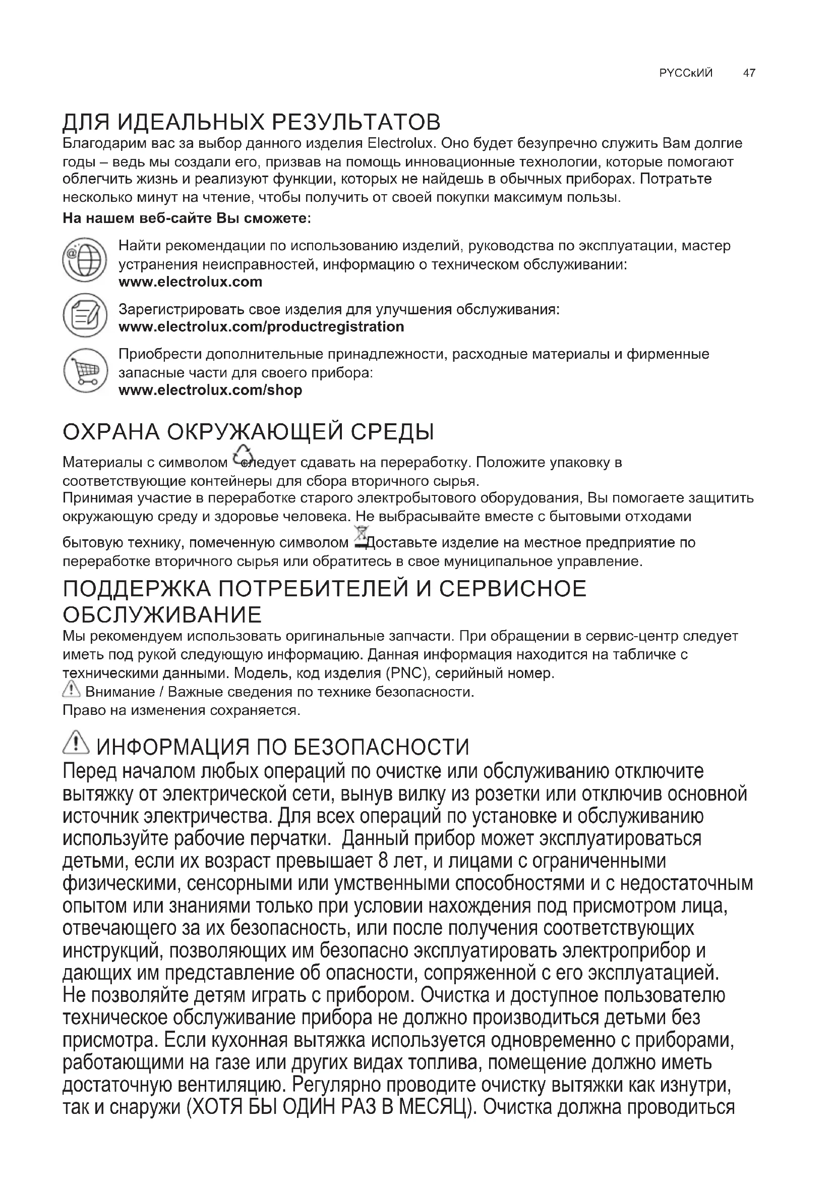 Afbryd apparatet fra el-nettet Pas på! Sørg for at pærerne er kolde før de berøres. Udskift den beskadigede lampe Anvend udelukkende lamper med lysdiode på højst 3W-E14. For yderligere detaljer, se det vedlagte blad "ILCOS D" (alfanumerisk position "1d")47 PYCCĸИЙ ДЛЯ ИДЕАЛЬНЫХ РЕЗУЛЬТАТОВ Благодарим вас за выбор данного изделия Electrolux. Оно будет безупречно служить Вам долгие годы – ведь мы создали его, призвав на помощь инновационные технологии, которые помогают облегчить жизнь и реализуют функции, которых не найдешь в обычных приборах. Потратьте несколько минут на чтение, чтобы получить от своей покупки максимум пользы. На нашем веб-сайте Вы сможете: Найти рекомендации по использованию изделий, руководства по эксплуатации, мастер устранения неисправностей, информацию о техническом обслуживании: www.electrolux.com Зарегистрировать свое изделия для улучшения обслуживания: www.electrolux.com/productregistration Приобрести дополнительные принадлежности, расходные материалы и фирменные запасные части для своего прибора: www.electrolux.com/shop ОХРАНА ОКРУЖАЮЩЕЙ СРЕДЫ Материалы с символом следует сдавать на переработку. Положите упаковку в соответствующие контейнеры для сбора вторичного сырья. Принимая участие в переработке старого электробытового оборудования, Вы помогаете защитить окружающую среду и здоровье человека. Не выбрасывайте вместе с бытовыми отходами бытовую технику, помеченную символом . Доставьте изделие на местное предприятие по переработке вторичного сырья или обратитесь в свое муниципальное управление. ПОДДЕРЖКА ПОТРЕБИТЕЛЕЙ И СЕРВИСНОЕ ОБСЛУЖИВАНИЕ Мы рекомендуем использовать оригинальные запчасти. При обращении в сервис-центр следует иметь под рукой следующую информацию. Данная информация находится на табличке с техническими данными. Модель, код изделия (PNC), серийный номер. Внимание / Важные сведения по технике безопасности. Право на изменения сохраняется. ИНФОРМАЦИЯ ПО БЕЗОПАСНОСТИ Перед началом любых операций по очистке или обслуживанию отключите вытяжку от электрической сети, вынув вилку из розетки или отключив основной источник электричества. Для всех операций по установке и обслуживанию используйте рабочие перчатки. Данный прибор может эксплуатироваться детьми, если их возраст превышает 8 лет, и лицами с ограниченными физическими, сенсорными или умственными способностями и с недостаточным опытом или знаниями только при условии нахождения под присмотром лица, отвечающего за их безопасность, или после получения соответствующих инструкций, позволяющих им безопасно эксплуатировать электроприбор и дающих им представление об опасности, сопряженной с его эксплуатацией. Не позволяйте детям играть с прибором. Очистка и доступное пользователю техническое обслуживание прибора не должно производиться детьми без присмотра. Если кухонная вытяжка используется одновременно с приборами, работающими на газе или других видах топлива, помещение должно иметь достаточную вентиляцию. Регулярно проводите очистку вытяжки как изнутри, так и снаружи (ХОТЯ БЫ ОДИН РАЗ В МЕСЯЦ). Очистка должна проводиться