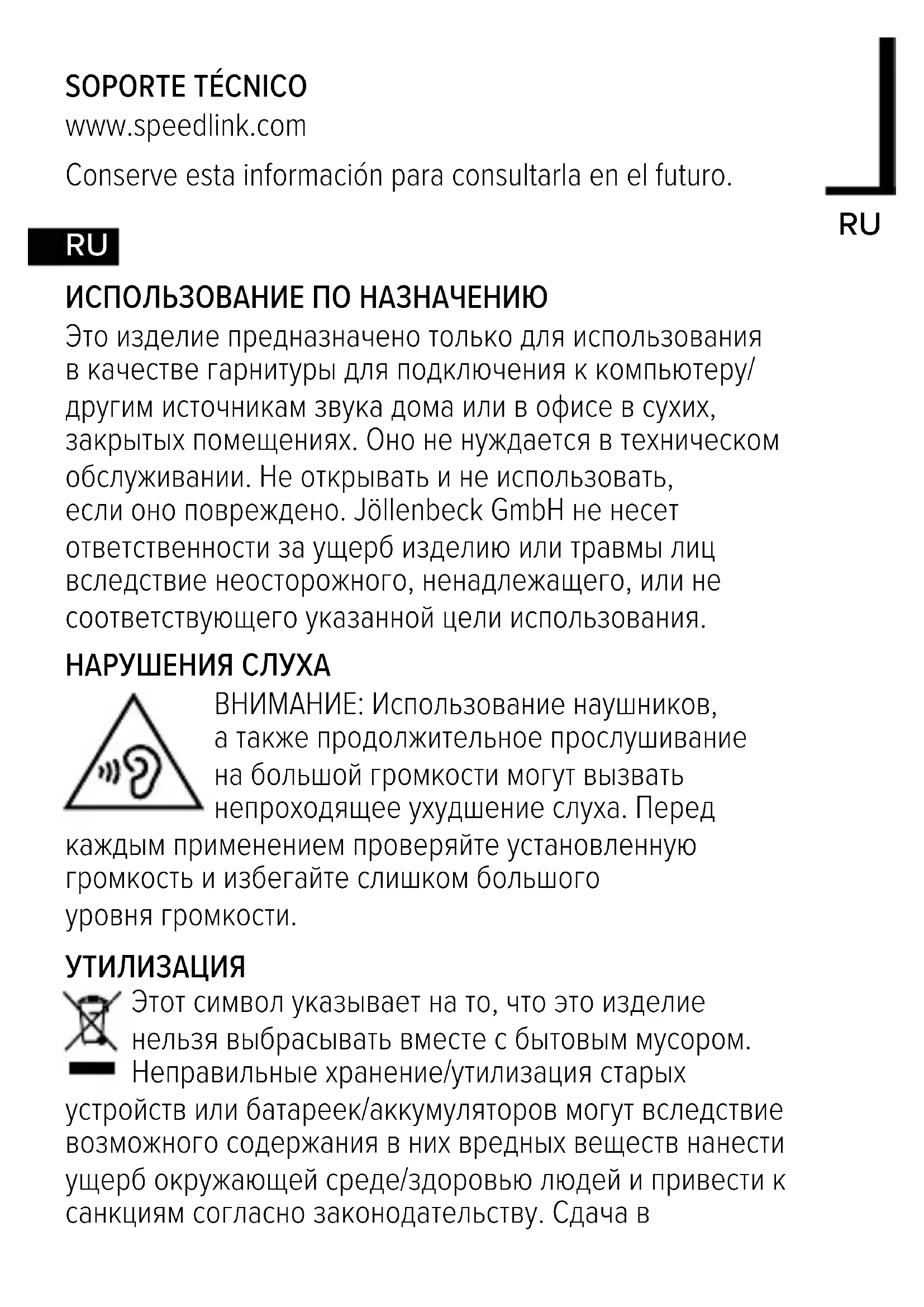 Этот символ указывает на то, что это изделие нельзя выбрасывать вместе с бытовым мусором. Неправильные хранение/утилизация старых устройств или батареек/аккумуляторов могут вследствие возможного содержания в них вредных веществ нанести ущерб окружающей среде/здоровью людей и привести к санкциям согласно законодательству. Сдача в RUспециальных официальных пунктах сбора является бесплатной и предписана законодательством, это обеспечивает правильную утилизацию или переработку/повторное использование и таким образом вносит вклад в защиту окружающей среды. Справку можно получить в официальных инстанциях, пунктах утилизации или в специализированных магазинах. Крупные магазины (торговая площадь для электроприборов ≥ 400м2) принимают небольшие устройства (все размеры < 25см) бесплатно, другие только при покупке равноценных изделий. Элементы питания/аккумуляторы по возможности вынуть. ИНФОРМАЦИЯ О СООТВЕТСТВИИ Из-за влияния сильных статических, электрических или высокочастотных полей (излучение радиоустановок, мобильных телефонов, микроволновых печей) могут возникнуть радиопомехи. В этом случае нужно увеличить расстояние от источников помех. ТЕХНИЧЕСКАЯ ПОДДЕРЖКА www.speedlink.com Сохраните эту информацию для использования в будущем.