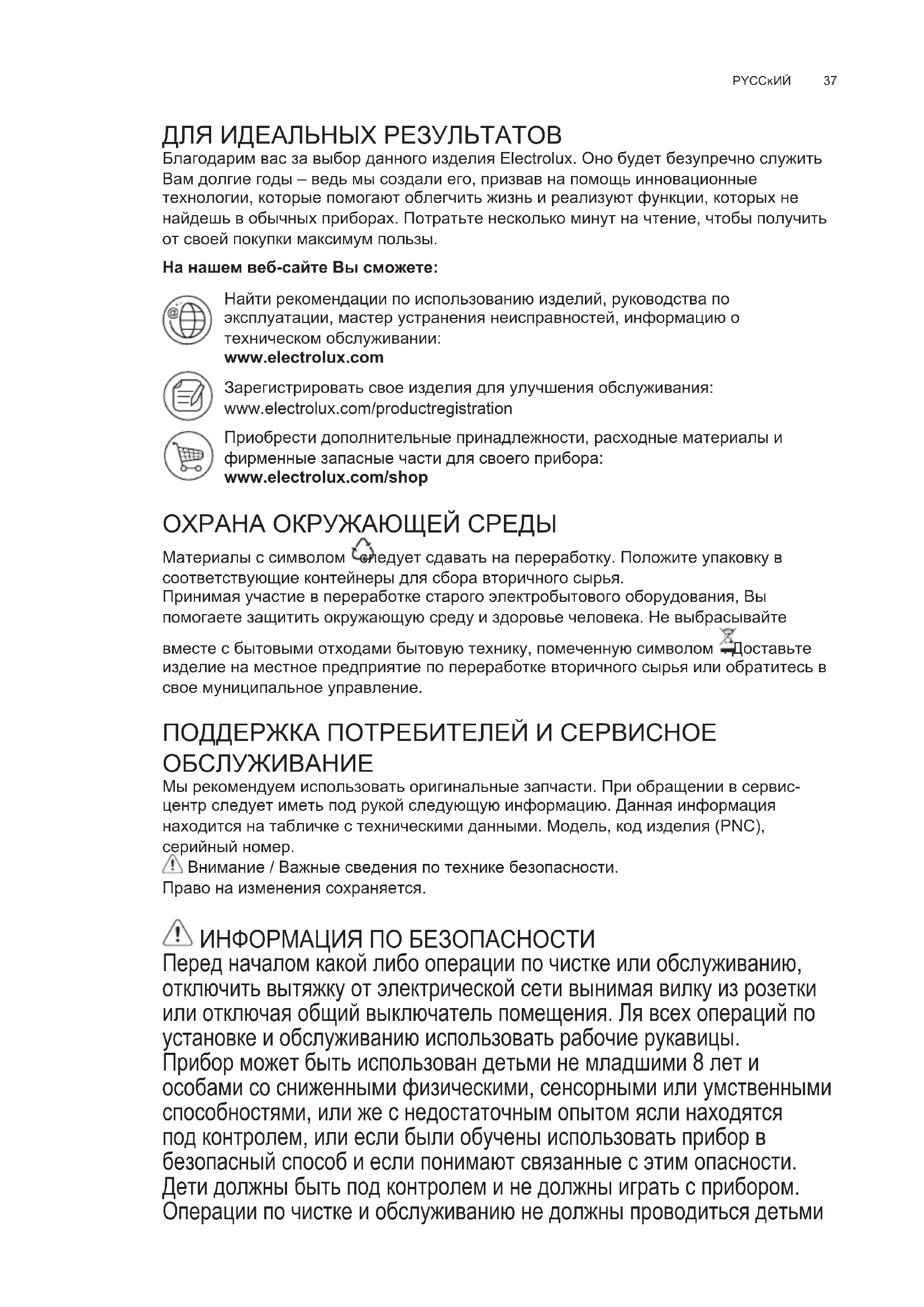 Afbryd apparatet fra el-nettet Pas på! Sørg for at pærerne er kolde før de berøres. Udskift den beskadigede pære. Benyt kun kerteformede halogenpærer Ø35mm E14 28W37 PYCCĸИЙ ДЛЯ ИДЕАЛЬНЫХ РЕЗУЛЬТАТОВ Благодарим вас за выбор данного изделия Electrolux. Оно будет безупречно служить Вам долгие годы – ведь мы создали его, призвав на помощь инновационные технологии, которые помогают облегчить жизнь и реализуют функции, которых не найдешь в обычных приборах. Потратьте несколько минут на чтение, чтобы получить от своей покупки максимум пользы. На нашем веб-сайте Вы сможете: Найти рекомендации по использованию изделий, руководства по эксплуатации, мастер устранения неисправностей, информацию о техническом обслуживании: www.electrolux.com Зарегистрировать свое изделия для улучшения обслуживания: wwwelectroluxcom/productregistration Приобрести дополнительные принадлежности, расходные материалы и фирменные запасные части для своего прибора: www.electrolux.com/shop ОХРАНА ОКРУЖАЮЩЕЙ СРЕДЫ Материалы с символом следует сдавать на переработку. Положите упаковку в соответствующие контейнеры для сбора вторичного сырья. Принимая участие в переработке старого электробытового оборудования, Вы помогаете защитить окружающую среду и здоровье человека. Не выбрасывайте вместе с бытовыми отходами бытовую технику, помеченную символом . Доставьте изделие на местное предприятие по переработке вторичного сырья или обратитесь в свое муниципальное управление. ПОДДЕРЖКА ПОТРЕБИТЕЛЕЙ И СЕРВИСНОЕ ОБСЛУЖИВАНИЕ Мы рекомендуем использовать оригинальные запчасти. При обращении в сервис- центр следует иметь под рукой следующую информацию. Данная информация находится на табличке с техническими данными. Модель, код изделия (PNC), серийный номер. Внимание / Важные сведения по технике безопасности. Право на изменения сохраняется. ИНФОРМАЦИЯ ПО БЕЗОПАСНОСТИ Перед началом какой либо операции по чистке или обслуживанию, отключить вытяжку от электрической сети вынимая вилку из розетки или отключая общий выключатель помещения. Ля всех операций по установке и обслуживанию использовать рабочие рукавицы. Прибор может быть использован детьми не младшими 8 лет и особами со сниженными физическими, сенсорными или умственными способностями, или же с недостаточным опытом ясли находятся под контролем, или если были обучены использовать прибор в безопасный способ и если понимают связанные с этим опасности. Дети должны быть под контролем и не должны играть с прибором. Операции по чистке и обслуживанию не должны проводиться детьми