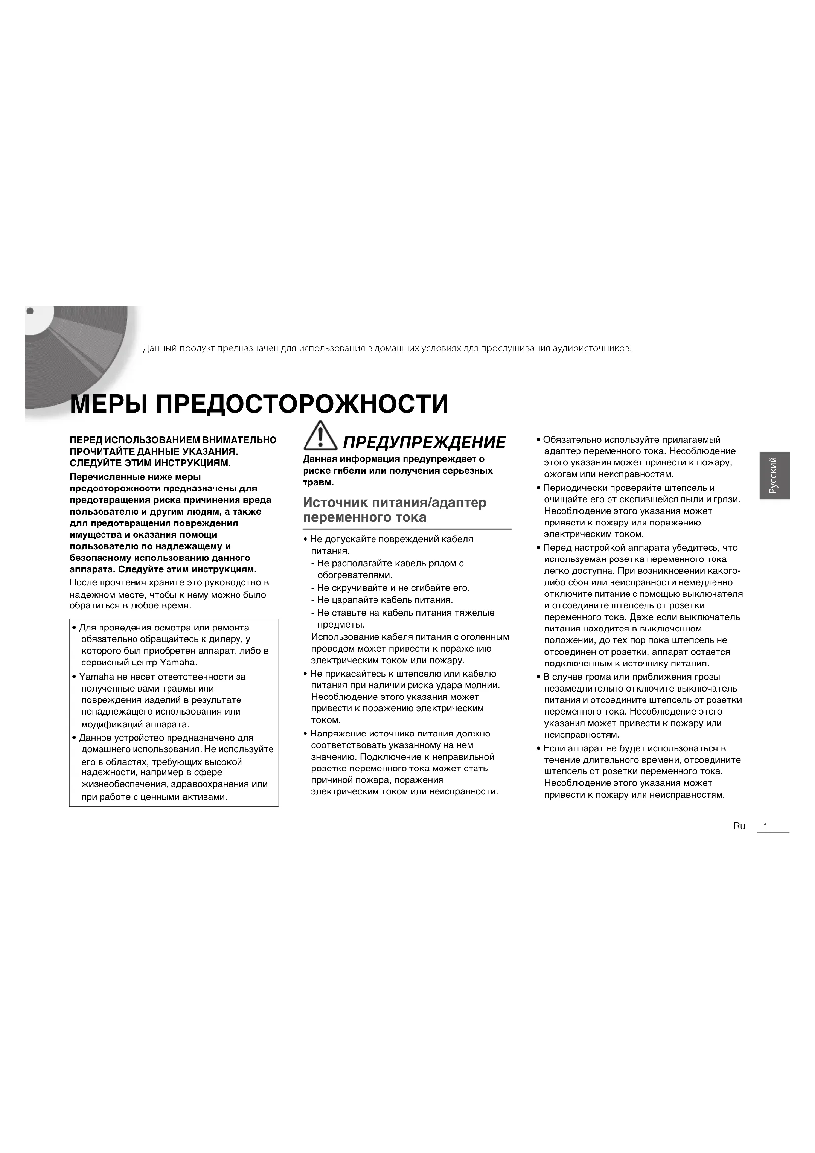 Данный продукт предназначен для использования в домашних условиях для прослушивания аудиоисточников. МЕРЫ ПРЕДОСТОРОЖНОСТИ ПЕРЕД ИСПОЛЬЗОВАНИЕМ ВНИМАТЕЛЬНО ПРОЧИТАЙТЕ ДАННЫЕ УКАЗАНИЯ. СЛЕДУЙТЕ ЭТИМ ИНСТРУКЦИЯМ.Перечисленные ниже меры предосторожности предназначены для предотвращения риска причинения вреда пользователю и другим людям, а также для предотвращения повреждения имущества и оказания помощи пользователю по надлежащему и безопасному использованию данного аппарата. Следуйте этим инструкциям.После прочтения храните это руководство в надежном месте, чтобы к нему можно было обратиться в любое время. ПРЕДУПРЕЖДЕНИЕ Данная информация предупреждает о риске гибели или получения серьезных травм. Источник питания/адаптер переменного тока