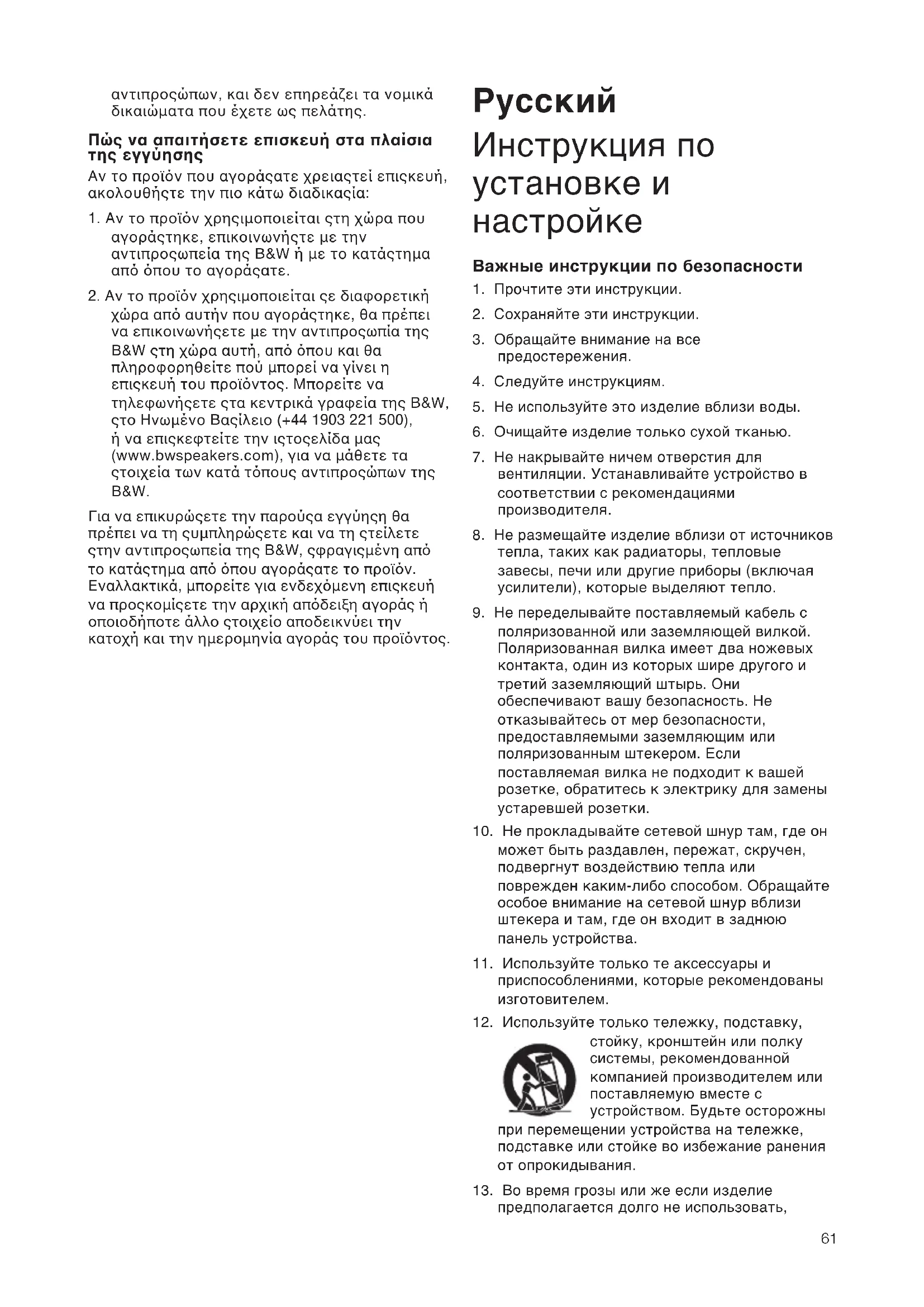 7575 CTSWxx SA1000 Inside 13/1/09 9:45 Page 62Введение Уважаемый покупатель, Спасибо, что вы выбрали Bowers & Wilkins. Пожалуйста, прочтите эту Инструкцию внимательно перед распаковкой и установкой продукта. Это поможет вам оптимизировать его характеристики. B&W имеет сеть специализированных дистрибьюторов более, чем в 60 странах, и они смогут помочь вам при возникновении любых проблем, с которыми не справились дилеры. Информация по защите окружающей