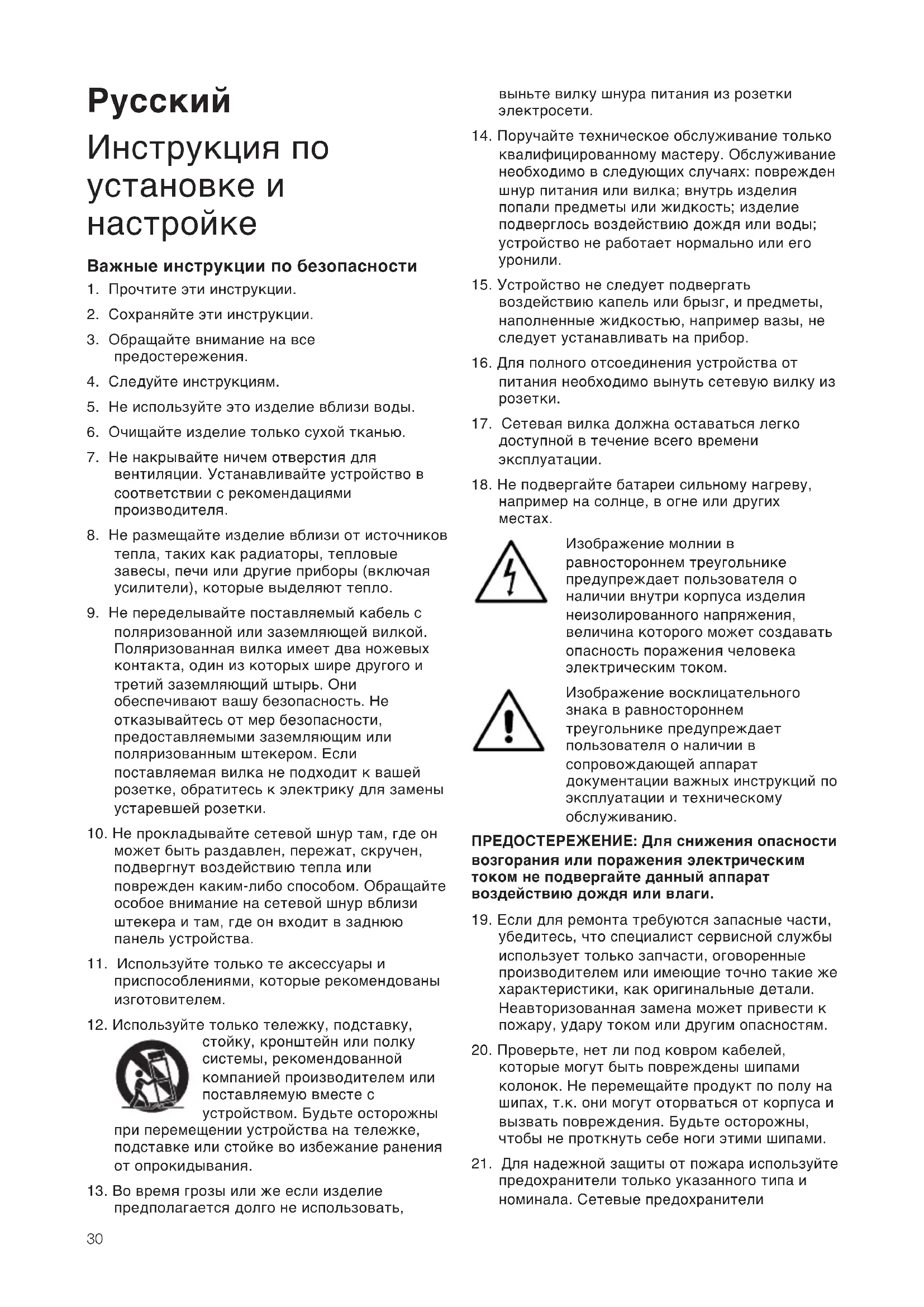 Изображение молнии в равностороннем треугольнике предупреждает пользователя о наличии внутри корпуса изделия неизолированного напряжения, величина которого может создавать опасность поражения человека электрическим током. Изображение восклицательного знака в равностороннем треугольнике предупреждает пользователя о наличии в сопровождающей аппарат документации важных инструкций по эксплуатации и техническому обслуживанию. ПРЕДОСТЕРЕЖЕНИЕ: Для снижения опасности возгорания или поражения электрическим током не подвергайте данный аппарат воздействию дождя или влаги.