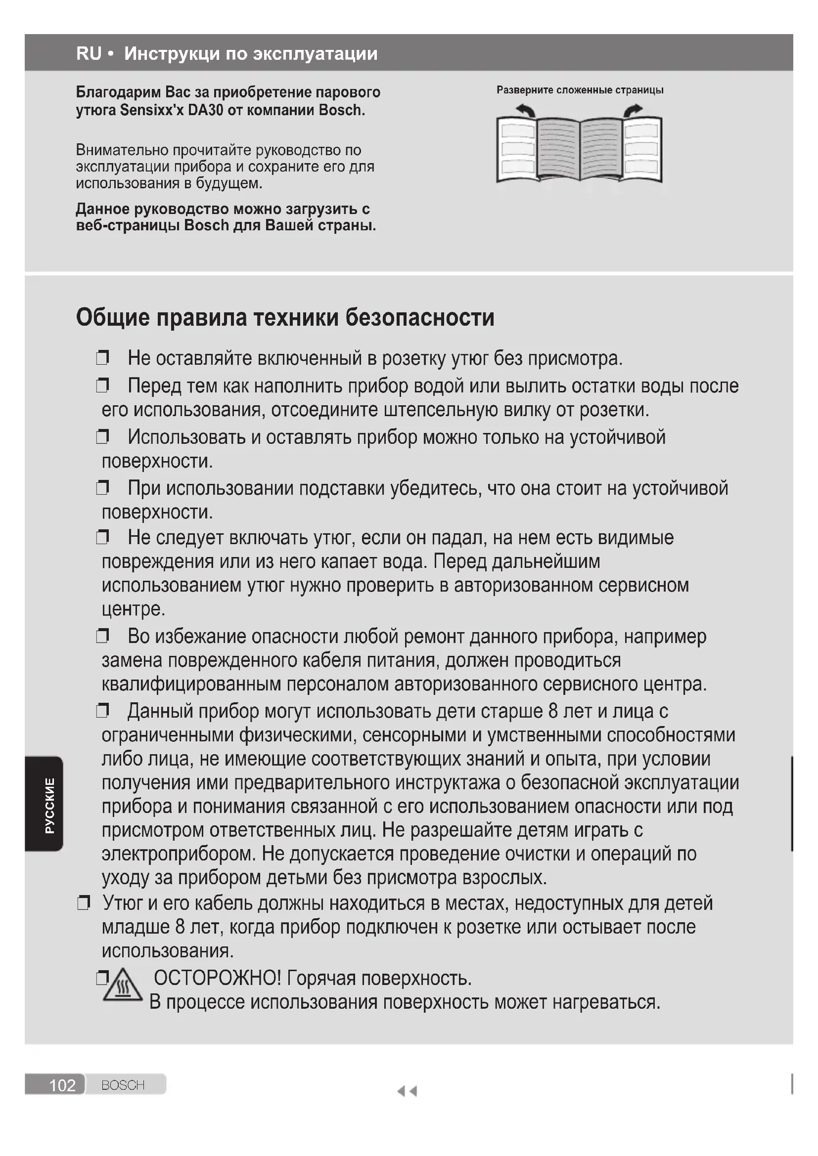 ОСТОРОЖНО! Горячая поверхность. В процессе использования поверхность может нагреваться. RU • Инструкци по эксплуатации Благодарим Вас за приобретение парового утюга Sensixx'x DA30 от компании Bosch. Внимательно прочитайте руководство по эксплуатации прибора и сохраните его для использования в будущем. Данное руководство можно загрузить с веб-страницы Bosch для Вашей страны. Разверните сложенные страницы103 B O S C H