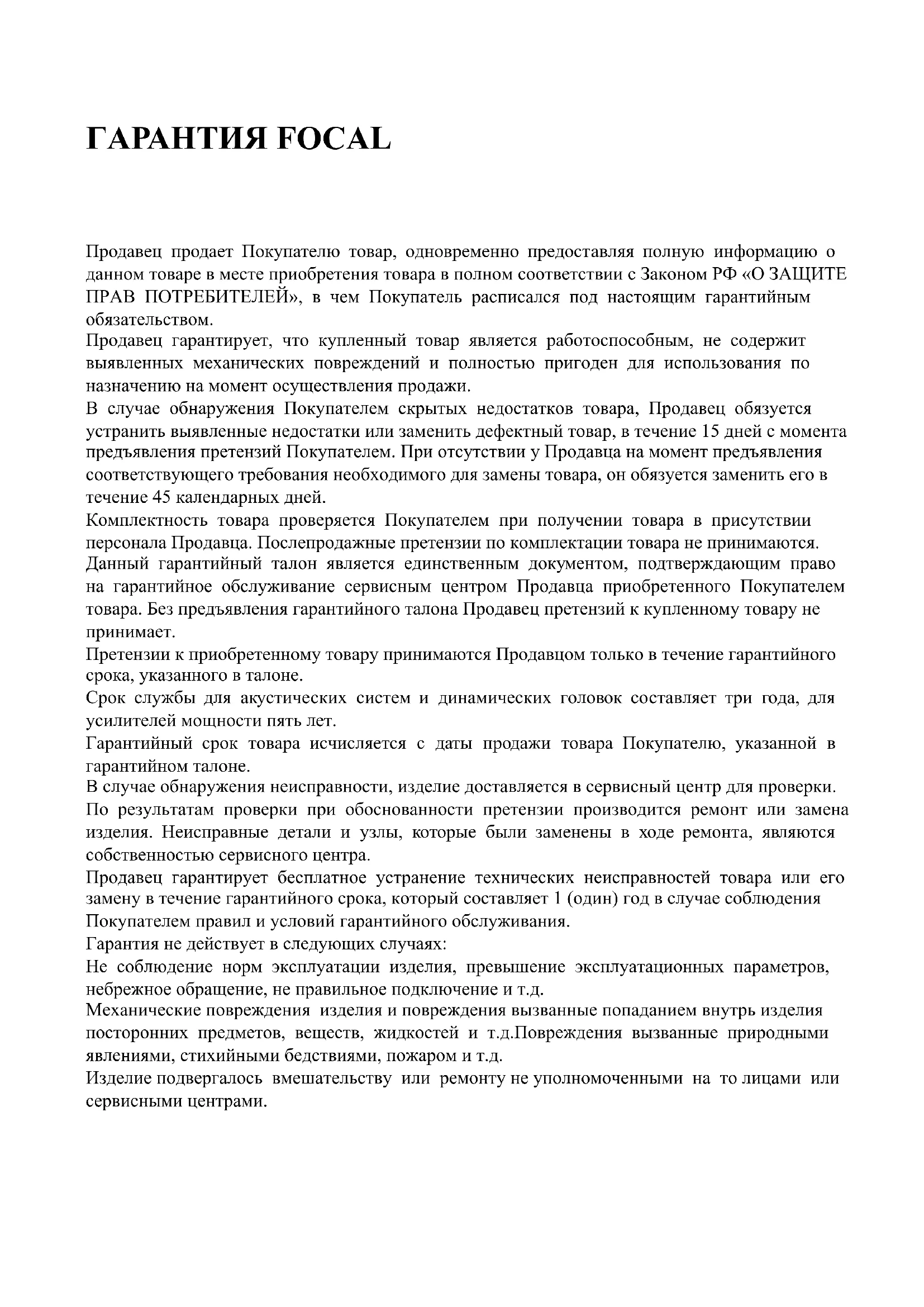 Претензии к приобретенному товару принимаются Продавцом только в течение гарантийного срока, указанного в талоне. Срок службы для акустических систем и динамических головок составляет три года, для усилителей мощности пять лет. Гарантийный срок товара исчисляется с даты продажи товара Покупателю, указанной в гарантийном талоне. В случае обнаружения неисправности, изделие доставляется в сервисный центр для проверки. По результатам проверки при обоснованности претензии производится ремонт или замена изделия. Неисправные детали и узлы, которые были заменены в ходе ремонта, являются собственностью сервисного центра. Продавец гарантирует бесплатное устранение технических неисправностей товара или его замену в течение гарантийного срока, который составляет 1 (один) год в случае соблюдения Покупателем правил и условий гарантийного обслуживания. Гарантия не действует в следующих случаях: Не соблюдение норм эксплуатации изделия, превышение эксплуатационных параметров, небрежное обращение, не правильное подключение и т.д. Механические повреждения изделия и повреждения вызванные попаданием внутрь изделия посторонних предметов, веществ, жидкостей и т.д.Повреждения вызванные природными явлениями, стихийными бедствиями, пожаром и т.д. Изделие подвергалось вмешательству или ремонту не уполномоченными на то лицами или сервисными центрами. ГАРАНТИЯ FOCALВ случае установки и подключения изделия не сертифицированными установочными