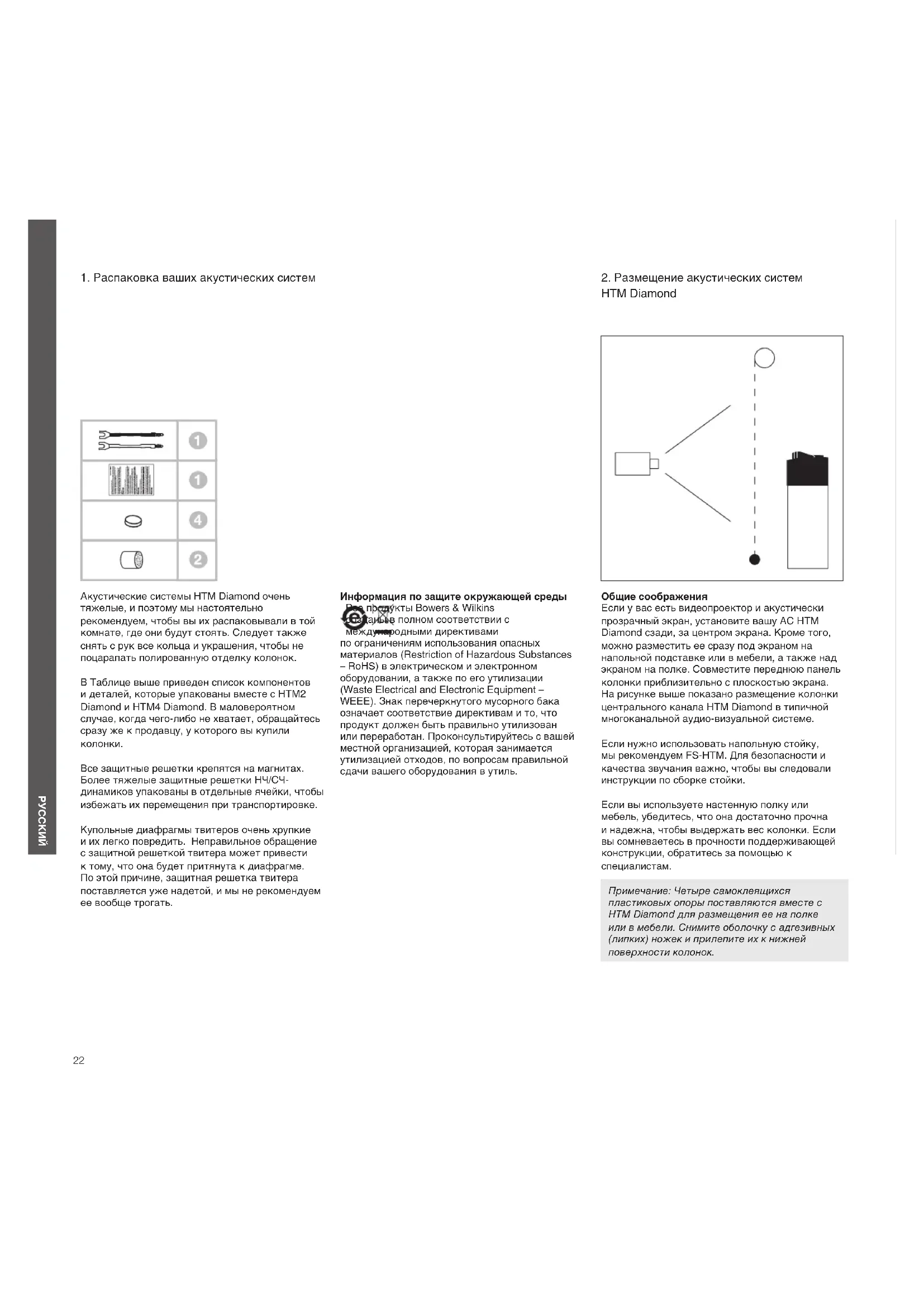 Все защитные решетки крепятся на магнитах. Более тяжелые защитные решетки НЧ/СЧ- динамиков упакованы в отдельные ячейки, чтобы избежать их перемещения при транспортировке. Купольные диафрагмы твитеров очень хрупкие и их легко повредить. Неправильное обращение с защитной решеткой твитера может привести к тому, что она будет притянута к диафрагме. По этой причине, защитная решетка твитера поставляется уже надетой, и мы не рекомендуем ее вообще трогать. Информация по защите окружающей среды Все продукты Bowers & Wilkins созданы в полном соответствии с международными директивами по ограничениям использования опасных материалов (Restriction of Hazardous Substances – RoHS) в электрическом и электронном оборудовании, а также по его утилизации (Waste Electrical and Electronic Equipment – WEEE). Знак перечеркнутого мусорного бака означает соответствие директивам и то, что продукт должен быть правильно утилизован или переработан. Проконсультируйтесь с вашей местной организацией, которая занимается утилизацией отходов, по вопросам правильной сдачи вашего оборудования в утиль. Общие соображения Если у вас есть видеопроектор и акустически прозрачный экран, установите вашу АС HTM Diamond сзади, за центром экрана. Кроме того, можно разместить ее сразу под экраном на напольной подставке или в мебели, а также над экраном на полке. Совместите переднюю панель колонки приблизительно с плоскостью экрана. На рисунке выше показано размещение колонки центрального канала HTM Diamond в типичной многоканальной аудио-визуальной системе. Если нужно использовать напольную стойку, мы рекомендуем FS-HTM. Для безопасности и качества звучания важно, чтобы вы следовали инструкции по сборке стойки. Если вы используете настенную полку или мебель, убедитесь, что она достаточно прочна и надежна, чтобы выдержать вес колонки. Если вы сомневаетесь в прочности поддерживающей конструкции, обратитесь за помощью к специалистам. Примечание: Четыре самоклеящихся пластиковых опоры поставляются вместе с HTM Diamond для размещения ее на полке или в мебели. Снимите оболочку с адгезивных (липких) ножек и прилепите их к нижней поверхности колонок.23