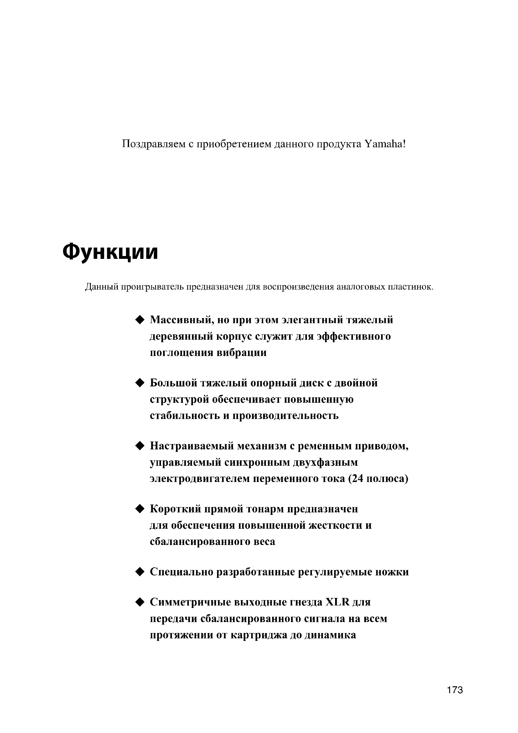 Уход за аппаратом Протирайте аппарат мягкой сухой тканью. Если аппарат имеет черное фортепианное покрытие, рекомендуется использовать чистящую салфетку для фортепиано. Не используйте химические средства такие как бензин или растворитель, т.к. они могут повредить поверхность. Уход за иглой пластинки Кончик иглы пластинки очень чувствительный. Обращайтесь с ним очень аккуратно, чтобы не повредить. При налипании пыли на кончике иглы используйте мягкую заостренную кисть, чтобы стереть ее, начиная от основания иглы в направлении кончика, либо используйте имеющийся в продаже специальный инструмент для чистки.ПримечаниеПеред проведением чистки или обслуживания аппарата или иглы обязательно выключайте питание аппарата. Уход за пластинками Грязь, налипающая на пластинку, может вызвать перескакивание или шум при воспроизведении. Используйте имеющийся в продаже инструмент для чистки пластинок, чтобы стереть грязь.193 Замена ремня При определенных условиях ремень может износиться или разорваться. Если это произошло, замените ремень. Для замены ремня обратитесь к ближайшему авторизованному дилеру Yamaha или в сервисный центр.