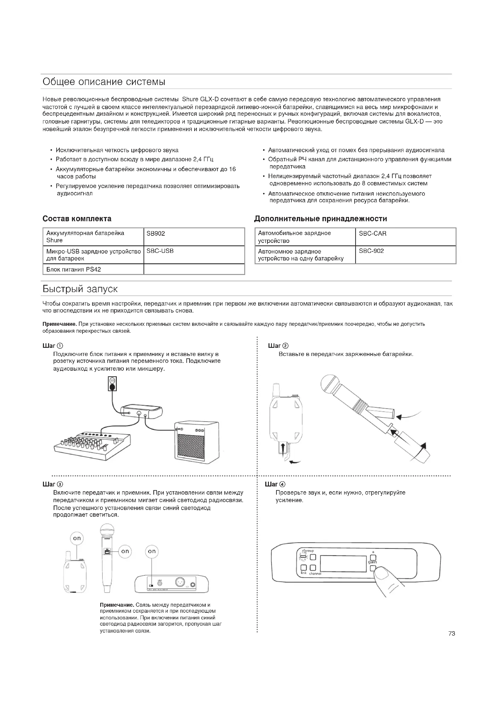 - Consulte o fabricante do equipamento ou um técnico de rádio/televisão experiente.73 Общее описание системы Новые революционные беспроводные системы Shure GLX-D сочетают в себе самую передовую технологию автоматического управления частотой с лучшей в своем классе интеллектуальной перезарядкой литиево-ионной батарейки, славящимися на весь мир микрофонами и беспрецедентным дизайном и конструкцией. Имеется широкий ряд переносных и ручных конфигураций, включая системы для вокалистов, головные гарнитуры, системы для теледикторов и традиционные гитарные варианты. Революционные беспроводные системы GLX-D — это новейший эталон безупречной легкости применения и исключительной четкости цифрового звука.