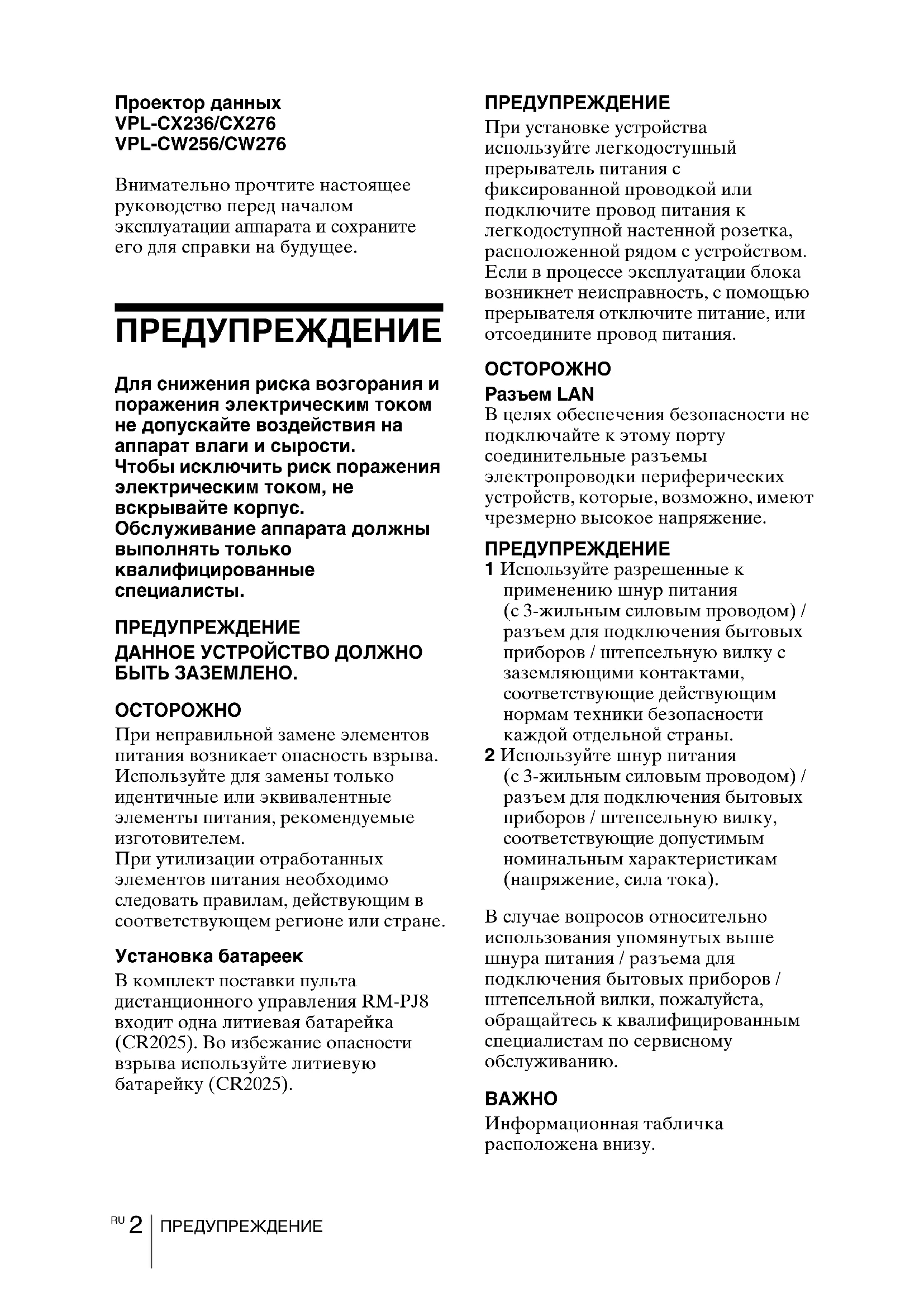 ПРЕДУПРЕЖДЕНИЕ Проектор данных VPL-CX236/CX276 VPL-CW256/CW276 Внимательно прочтите настоящее руководство перед началом эксплуатации аппарата и сохраните его для справки на будущее. ПРЕДУПРЕЖДЕНИЕ Для снижения риска возгорания и поражения электрическим током не допускайте воздействия на аппарат влаги и сырости. Чтобы исключить риск поражения электрическим током, не вскрывайте корпус. Обслуживание аппарата должны выполнять только квалифицированные специалисты. ПРЕДУПРЕЖДЕНИЕ ДАННОЕ УСТРОЙСТВО ДОЛЖНО БЫТЬ ЗАЗЕМЛЕНО.