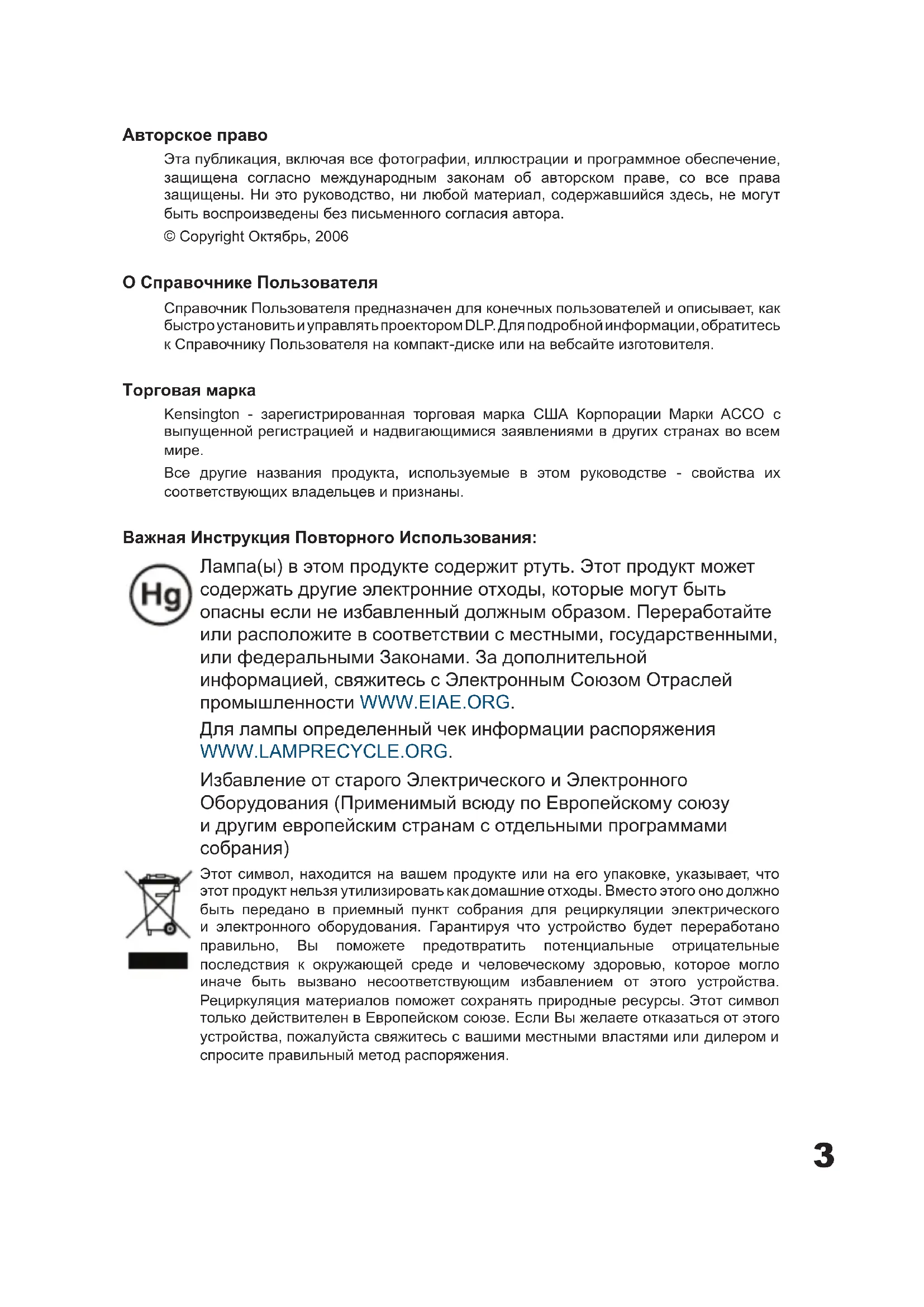 Все другие названия продукта, используемые в этом руководстве - свойства их соответствующих владельцев и признаны. Важная Инструкция Повторного Использования: Лампа(ы) в этом продукте содержит ртуть. Этот продукт может содержать другие электронние отходы, которые могут быть опасны если не избавленный должным образом. Переработайте или расположите в соответствии с местными, государственными, или федеральными Законами. За дополнительной информацией, свяжитесь с Электронным Союзом Отраслей промышленности WWW.EIAE.ORG. Для лампы определенный чек информации распоряжения WWW.LAMPRECYCLE.ORG. Избавление от старого Электрического и Электронного Оборудования (Применимый всюду по Европейскому союзу и другим европейским странам с отдельными программами