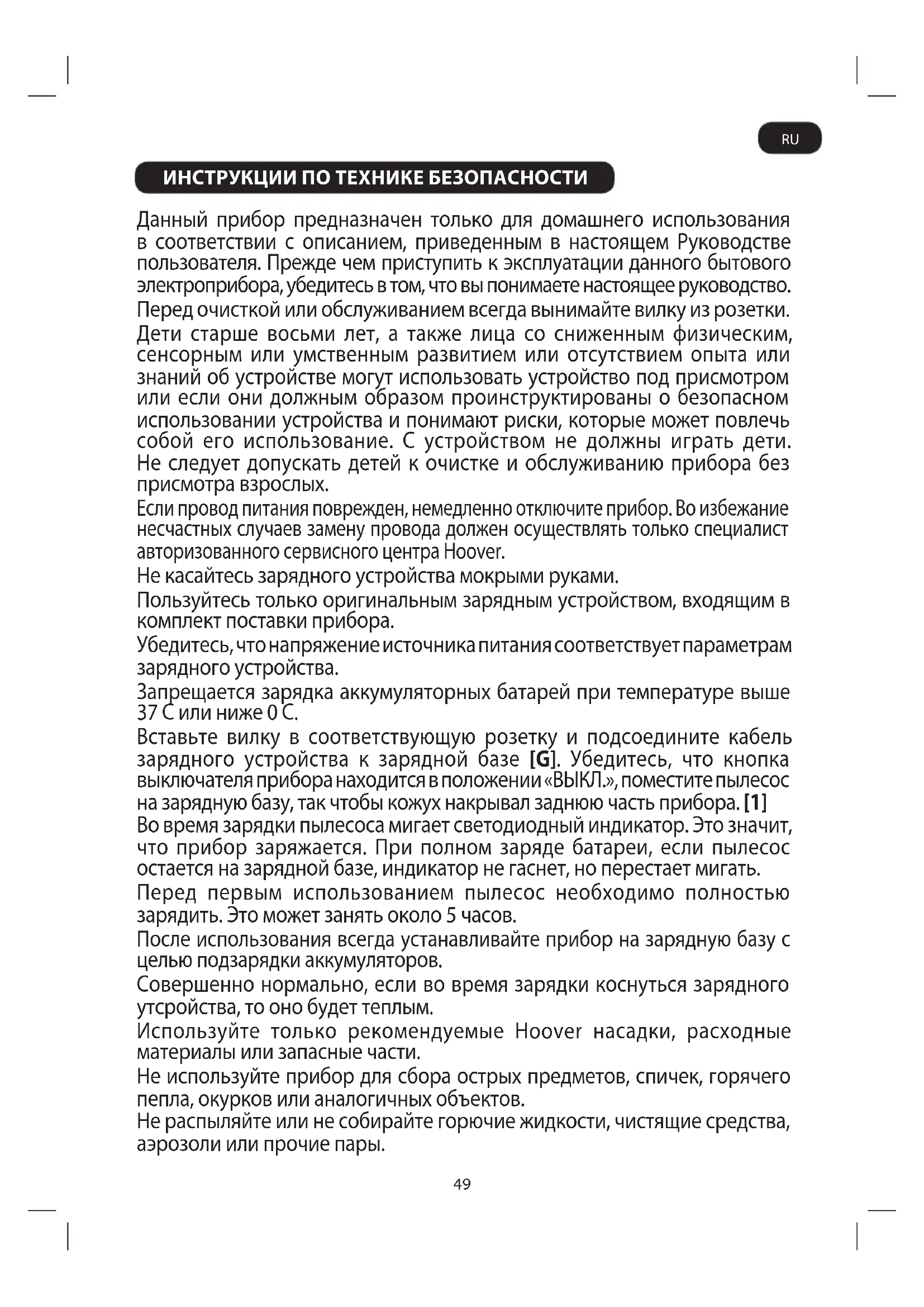 Η απόσυρση τη συσκευή πρέπει να γίνει σύφωνα ε του ισχύοντε κανονισού για θέατα προστασία του περιβάλλοντο . Για περισσότερε πληροφορίε σχετικά ε τη διαχείριση, την ανάκτηση και την ανακύκλωση του προϊόντο, επικοινωνήστε ε την αρόδια τοπική υπηρεσία , την υπηρεσία αποκοιδή οικιακών απορριάτων ή το κατάστηα που το αγοράσατε. Αυτό το προϊόν πληροί τι ευρωπαϊκέ οδηγίε ε αριθο 2006/95/ΕΚ, 2004/108/ΕΚ και 2011/65/ΕΚ. HOOVER Limited Pentrebach, Merthyr Tydl, Mid Glamorgan CF48 4TU ΣΥΝΤΗΡΗΣΗ ΦΙΛΤΡΟΥ Η ΕΓΓΥΗΣΗ ΣΑΣ Οι όροι ισχύο τη εγγύηση τη συσκευή καθορίζονται από τον αντιπρόσωπο τη χώρα στην οποία έχει πραγατοποιηθεί η πώληση. Περισσότερε πληροφορίε σχετικά ε του όρου εγγύηση πορείτε να ζητήσετε από τον αντιπρόσωπο που αγοράσατε τη συσκευή. Η προσκόιση του τιολογίου ή τη απόδειξη αγορά είναι βασική προυπόθεση για την ισχύ τη εγγύηση . Ο κατασκευαστή διατηρεί το δικαίωα να επιφέρει αλλαγέ χωρί προγενέστερη ενηέρωση. ΒΟΥΡΤΣΑ ΞΕΣΚΟΝΊΣΜΑΤΟΣ Εφαρόστε την βούρτσα ξεσκονίσατο στο δοχείο σκόνη για να καθαρίσετε πληκτρολόγια κι άλλε ευαίσθητε περιοχέ. [4] Βούρτσα για σχισέ* Βάλτε το ένα άκρο του εύκαπτου σωλήνα στο στόιο αναρρόφηση και συνδέστε τη βούρτσα για σχισέ στο άλλο άκρο του εύκαπτου σωλήνα. [5] GR49 ИНСТРУКЦИИ ПО ТЕХНИКЕ БЕЗОПАСНОСТИ Данный прибор предназначен только для домашнего использования в соответствии с описанием, приведенным в настоящем Руководстве пользователя. Прежде чем приступить к эксплуатации данного бытового электроприбора, убедитесь в том, что вы понимаете настоящее руководство. Перед очисткой или обслуживанием всегда вынимайте вилку из розетки. Дети старше восьми лет, а также лица со сниженным физическим, сенсорным или умственным развитием или отсутствием опыта или знаний об устройстве могут использовать устройство под присмотром или если они должным образом проинструктированы о безопасном использовании устройства и понимают риски, которые может повлечь собой его использование. С устройством не должны играть дети. Не следует допускать детей к очистке и обслуживанию прибора без присмотра взрослых. Если провод питания поврежден, немедленно отключите прибор. Во избежание несчастных случаев замену провода должен осуществлять только специалист авторизованного сервисного центра Hoover. Не касайтесь зарядного устройства мокрыми руками. Пользуйтесь только оригинальным зарядным устройством, входящим в комплект поставки прибора. Убедитесь, что напряжение источника питания соответствует параметрам зарядного устройства. Запрещается зарядка аккумуляторных батарей при температуре выше 37С или ниже 0С. Вставьте вилку в соответствующую розетку и подсоедините кабель зарядного устройства к зарядной базе [G]. Убедитесь, что кнопка выключателя прибора находится в положении «ВЫКЛ.», поместите пылесос на зарядную базу, так чтобы кожух накрывал заднюю часть прибора. [1] Во время зарядки пылесоса мигает светодиодный индикатор. Это значит, что прибор заряжается. При полном заряде батареи, если пылесос остается на зарядной базе, индикатор не гаснет, но перестает мигать. Перед первым использованием пылесос необходимо полностью зарядить. Это может занять около 5 часов. После использования всегда устанавливайте прибор на зарядную базу с целью подзарядки аккумуляторов. Совершенно нормально, если во время зарядки коснуться зарядного утсройства, то оно будет теплы