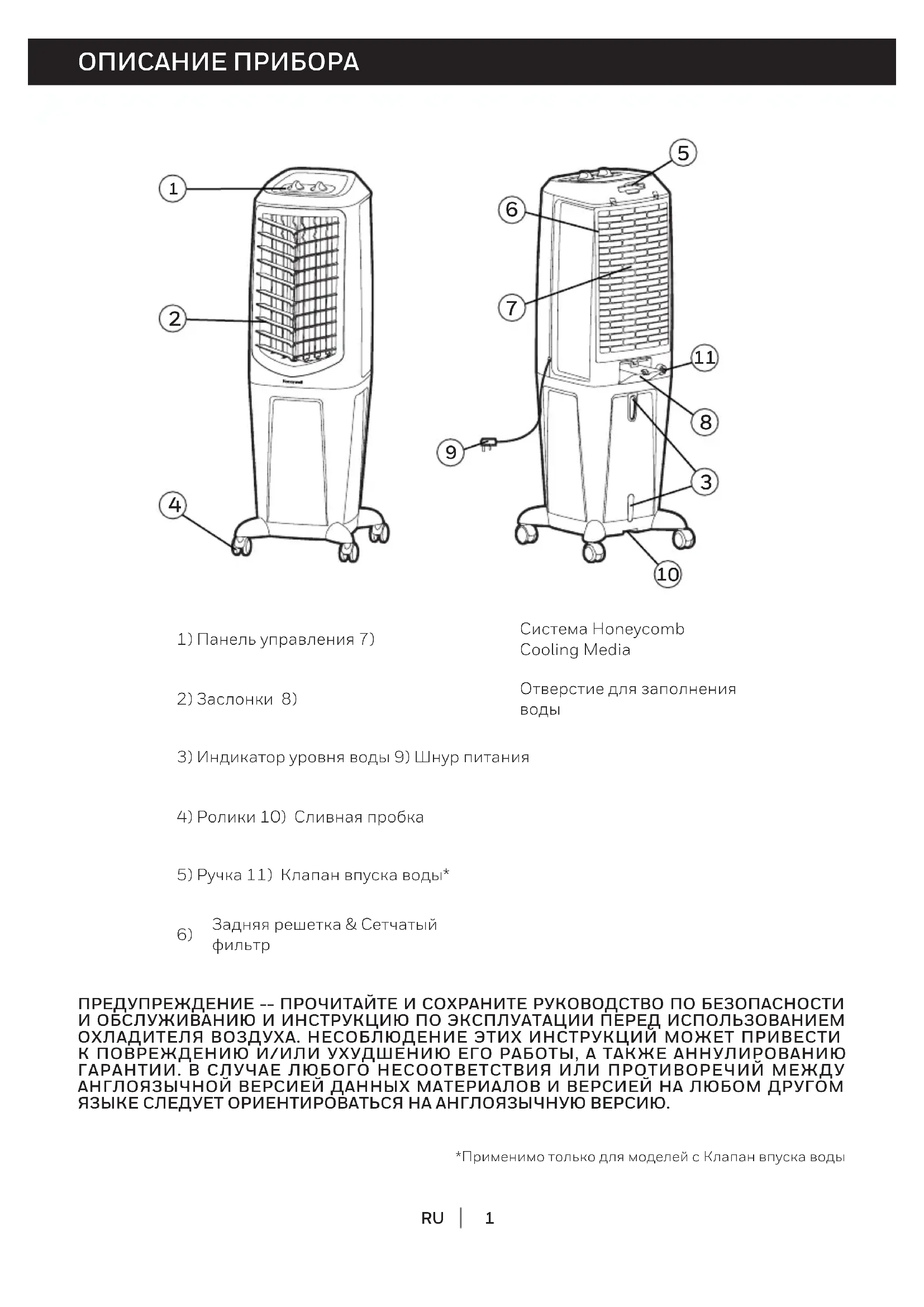 *Применимо только для моделей с Клапан впуска воды ПРЕДУПРЕЖДЕНИЕ -- ПРОЧИТАЙТЕ И СОХРАНИТЕ РУКОВОДСТВО ПО БЕЗОПАСНОСТИ И ОБСЛУЖИВАНИЮ И ИНСТРУКЦИЮ ПО ЭКСПЛУАТАЦИИ ПЕРЕД ИСПОЛЬЗОВАНИЕМ ОХЛАДИТЕЛЯ ВОЗДУХА. НЕСОБЛЮДЕНИЕ ЭТИХ ИНСТРУКЦИЙ МОЖЕТ ПРИВЕСТИ К ПОВРЕЖДЕНИЮ И/ИЛИ УХУДШЕНИЮ ЕГО РАБОТЫ, А ТАКЖЕ АННУЛИРОВАНИЮ ГАРАНТИИ. В СЛУЧАЕ ЛЮБОГО НЕСООТВЕТСТВИЯ ИЛИ ПРОТИВОРЕЧИЙ МЕЖДУ АНГЛОЯЗЫЧНОЙ ВЕРСИЕЙ ДАННЫХ МАТЕРИАЛОВ И ВЕРСИЕЙ НА ЛЮБОМ ДРУГОМ ЯЗЫКЕ СЛЕДУЕТ ОРИЕНТИРОВАТЬСЯ НА АНГЛОЯЗЫЧНУЮ ВЕРСИЮ.