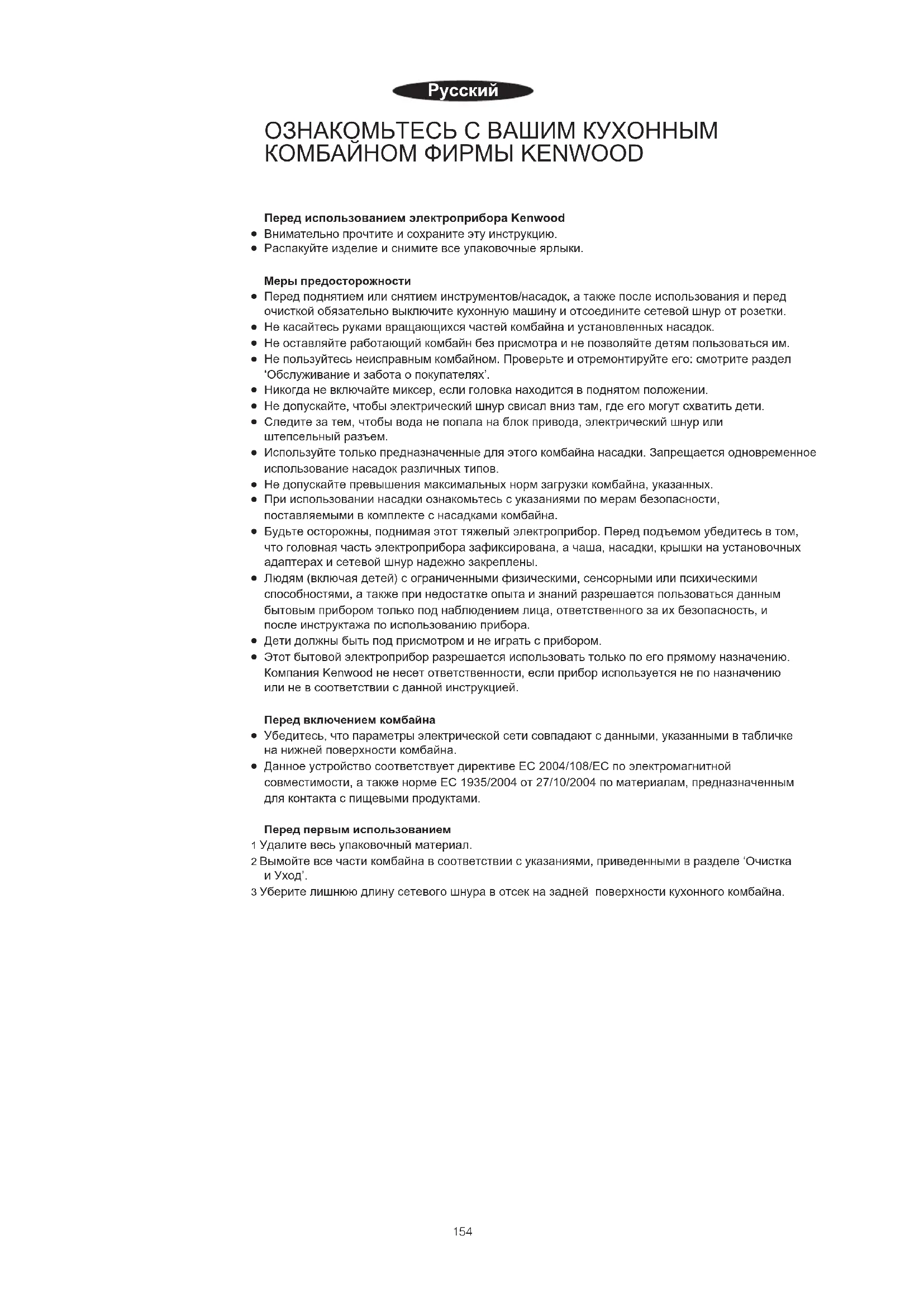 Этот бытовой электроприбор разрешается использовать только по его прямому назначению. Компания Kenwood не несет ответственности, если прибор используется не по назначению или не в соответствии с данной инструкцией. Перед включением комбайна