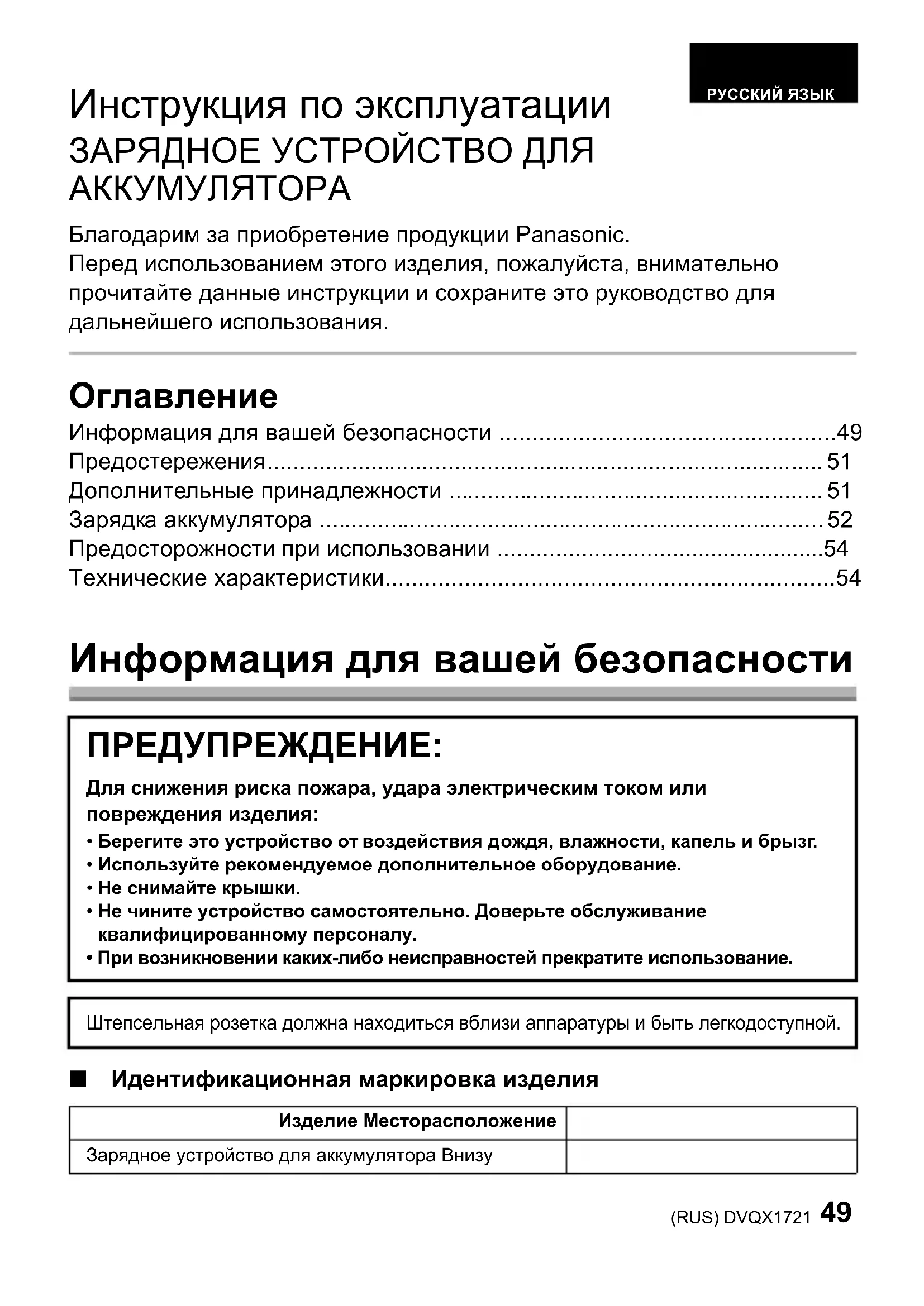 - Используйте рекомендуемое дополнительное оборудование.• Не снимайте крышки.• Не чините устройство самостоятельно. Доверьте обслуживание квалифицированному персоналу.• При возникновении каких-либо неисправностей прекратите использование. Штепсельная розетка должна находиться вблизи аппаратуры и быть легкодоступной. Изделие МесторасположениеЗарядное устройство для аккумулятора ВнизуРУССКИЙ ЯЗЫК DMW-BTC14_DVQX1721ZA.book 49 ページ 2019年1月28日 月曜日 午後8時11分DVQX1721 (RUS)