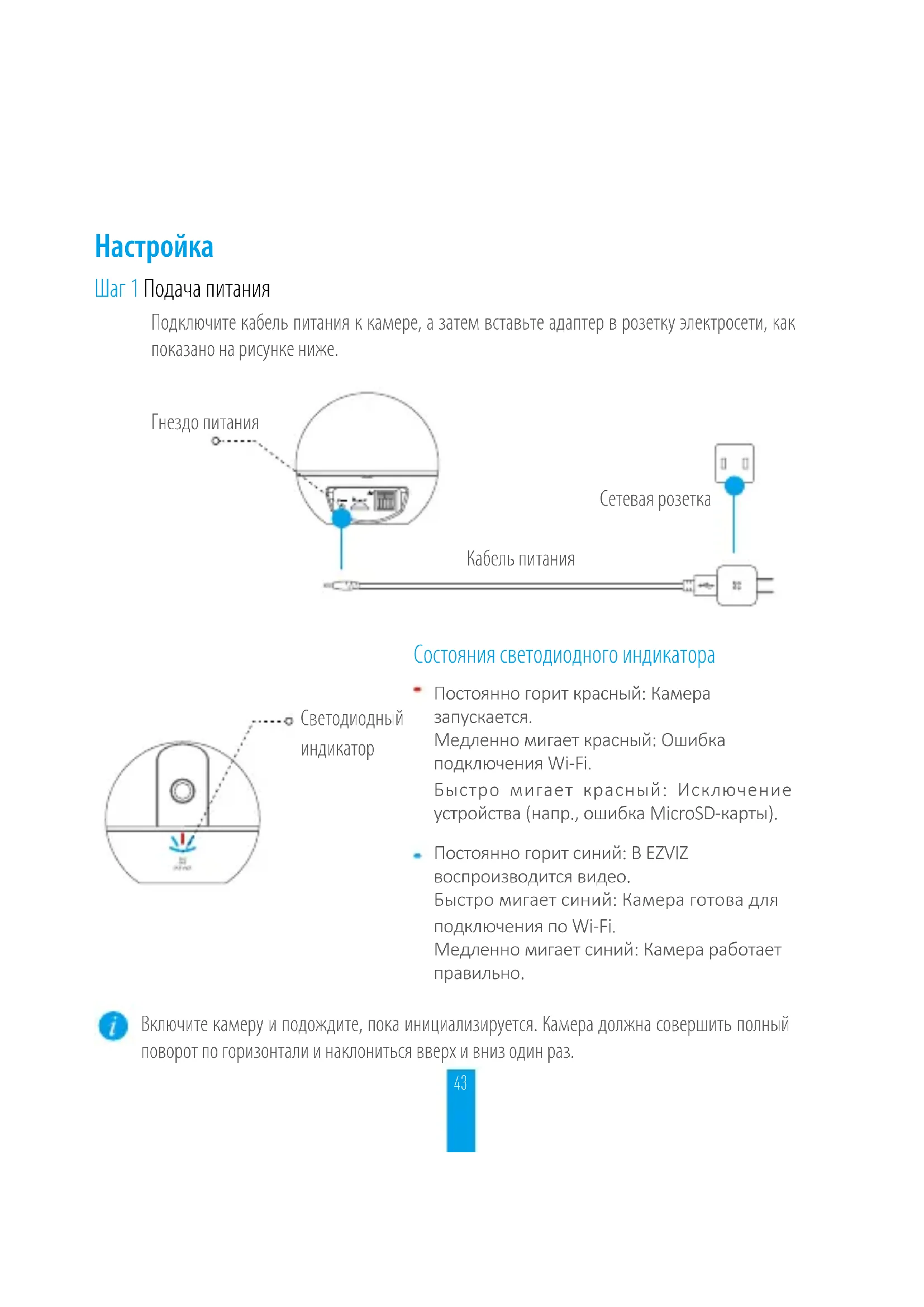 Шаг 1 Подача питания Подключите кабель питания к камере, а затем вставьте адаптер в розетку электросети, как показано на рисунке ниже. Сетевая розетка Гнездо питания Кабель питания Состояния светодиодного индикатора Постоянно горит красный: Камера запускается. Медленно мигает красный: Ошибка подключения Wi-Fi. Быстро мигает красный: Исключение устройства (напр., ошибка MicroSD-карты). Постоянно горит синий: В EZVIZ воспроизводится видео. Быстро мигает синий: Камера готова для подключения по Wi-Fi. Медленно мигает синий: Камера работает