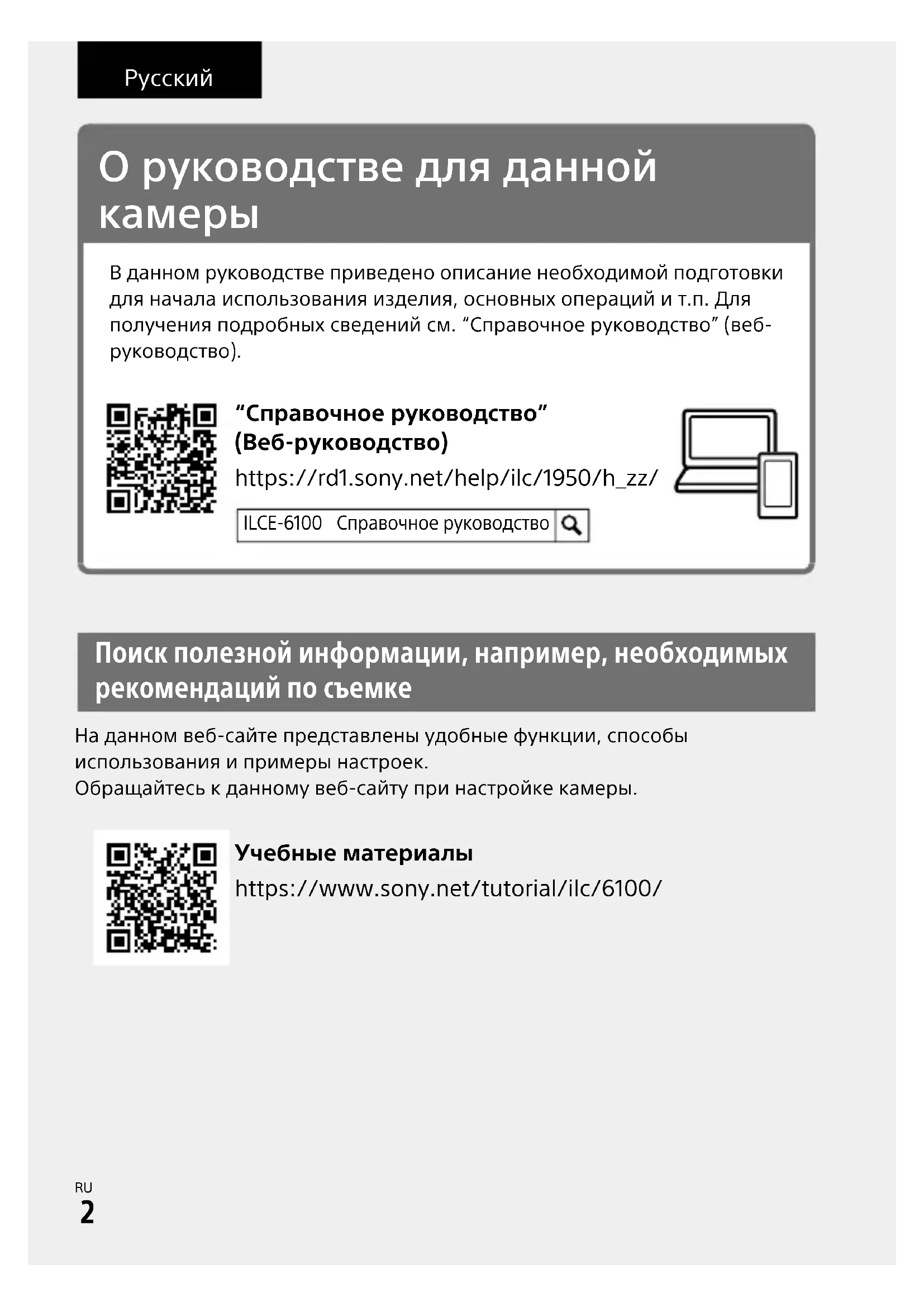 В данном руководстве приведено описание необходимой подготовки для начала использования изделия, основных операций и т.п. Для получения подробных сведений см. “Справочное руководство” (веб-руководство). https://rd1.sony.net/help/ilc/1950/h_zz/ “Справочное руководство” (Веб-руководство) ILCE-6100 Справочное руководство Поиск полезной информации, например, необходимых рекомендаций по съемке На данном веб-сайте представлены удобные функции, способы использования и примеры настроек.Обращайтесь к данному веб-сайту при настройке камеры. Учебные материалы https://www.sony.net/tutorial/ilc/6100/ РуcскийILCE-61005-009-876-41(1)