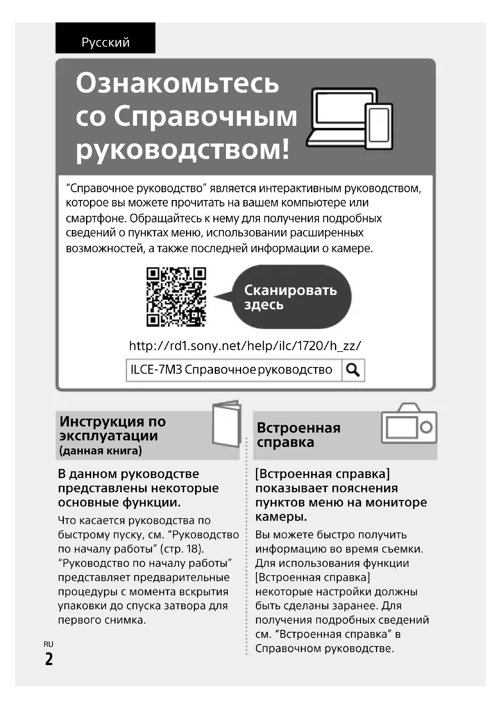 C:\1102\4732950411ILCE7M3CEC\09RU-ILCE7M3CEC\010BEF.indd DTP data saved: 2017/10/23 11:43 PDF file created: 2017/11/02 15:35 Руcский Ознакомьтесь со Справочным руководством! “Справочное руководство” является интерактивным руководством, которое вы можете прочитать на вашем компьютере или смартфоне. Обращайтесь к нему для получения подробных сведений о пунктах меню, использовании расширенных возможностей, а также последней информации о камере. Сканировать