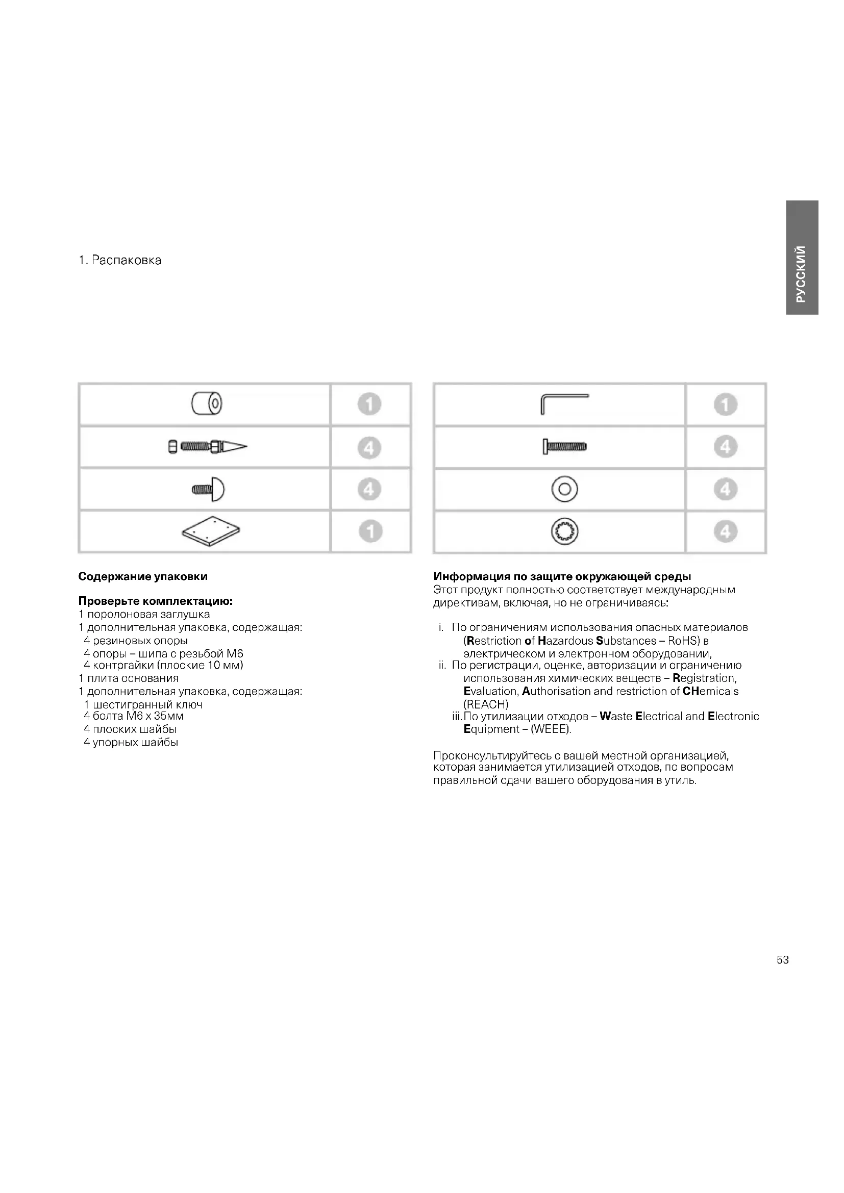 Содержание упаковки Проверьте комплектацию: 1 поролоновая заглушка 1 дополнительная упаковка, содержащая: 4 резиновых опоры 4 опоры – шипа с резьбой М6 4 контргайки (плоские 10 мм) 1 плита основания 1 дополнительная упаковка, содержащая: 1 шестигранный ключ 4 болта M6 x 35мм 4 плоских шайбы 4 упорных шайбы Информация по защите окружающей среды Этот продукт полностью соответствует международным директивам, включая, но не ограничиваясь:
