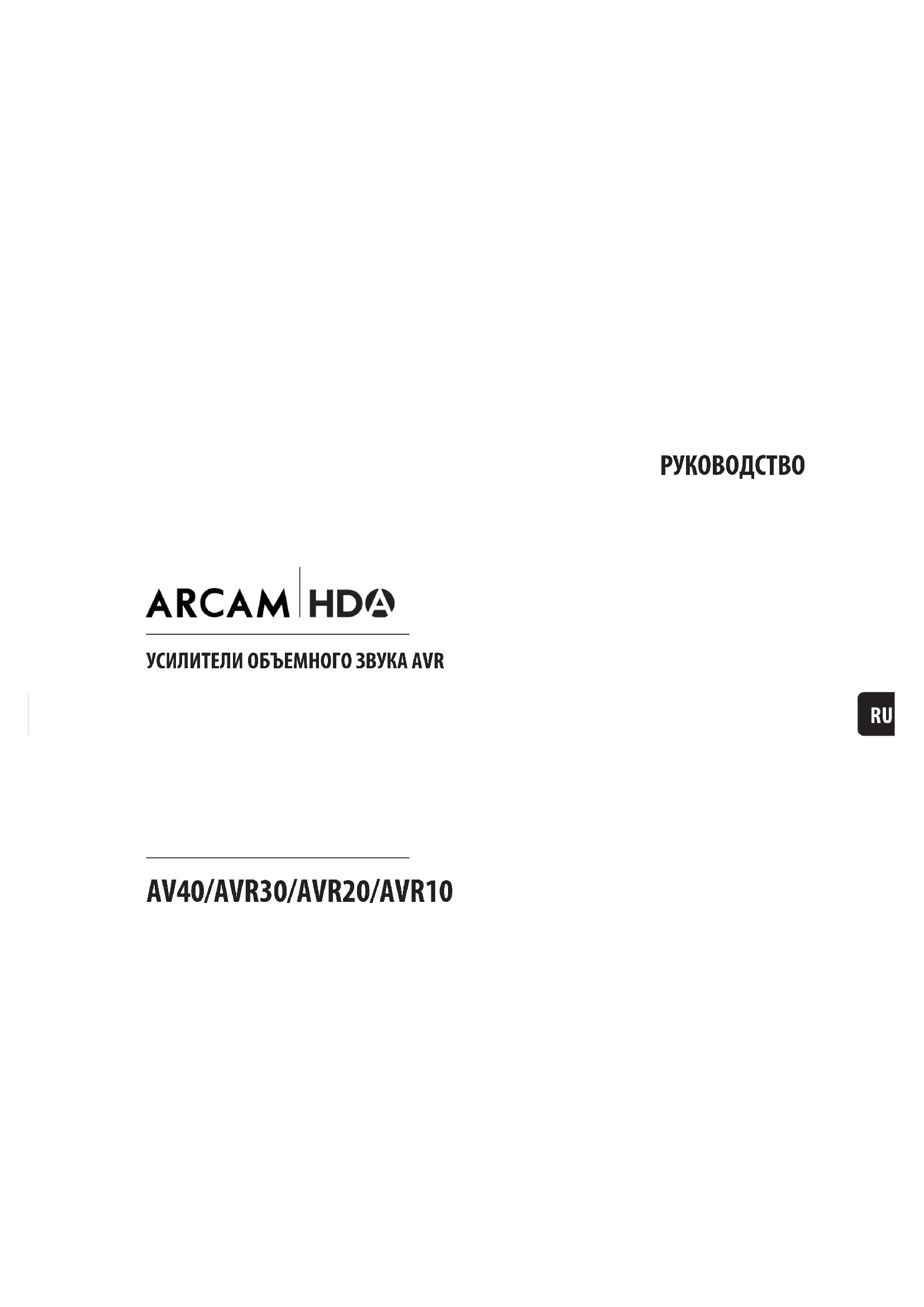 Работа Тюнера RU-37 Устранение неисправностей RU-38 Технические характеристики RU-40 Международная гарантия RU-42 Вам необходима профессиональная установка? Вполне возможно, что ваш ресивер был установлен и настроен как часть вашего оборудования Hi-Fi квалифицированным дилером компании Arcam. В этом случае вы можете пропустить разделы данного руководства, связанные с установкой и настройкой, и перейти непосредственно к разделам, которые касаются использования ресивера. Используйте содержание, чтобы перейти к этим разделам. Вы хотите установить ресивер самостоятельно? Ресивер – это мощная и сложная часть AV-оборудования. Если вы устанавливаете ресивер самостоятельно, мы рекомендуем вам до начала установки внимательно прочитать это руководство по эксплуатации. Например, правильная конфигурация динамиков и их размещение помогут раскрыть все преимущества вашего ресивера. Также убедитесь, что все элементы системы работают согласованно.RU-4 Перед началом работы… Ресивер Arcam HDA В ресиверах установлены процессоры домашних кинотеатров высокого качества и высокой производительности, а усилители спроектированы в соответствии с уровнем качества и стандартами производства компании Arcam. Они сочетают в себе цифровую обработку с высокими характеристиками аудио- и видеокомпонентов, чтобы создать для вас непревзойденный домашний развлекательный центр. Помимо внутренних FM-радиоприемников и радиоприемников цифрового вещания, ресиверы обеспечивают переключение и управление семью аналоговыми и шестью цифровыми источниками аудиосигнала, а также сетевыми источниками аудиосигнала, что делает эти модели идеальными концентраторами для домашних кинотеатров и двухканальных стереосистем. Поскольку многие из этих источников способны также генерировать видеосигналы, ресиверы обеспечивают высококачественное переключение видео- и аудосигнала HDMI (7 каналов HDMI 2.0b, HDCP 2.2). Управление ресивером осуществляется с помощью кнопок управления на передней панели, ИК-пульта дистанционного управления, IP-контроллера (Ethernet) или порта RS232. Пульт ДУ, поставляемый с ресивером, представляет собой универсальный обучаемый пульт дистанционного управления различными устройствами, который прост в использовании и после настройки способен управлять всей системой. Его также можно запрограммировать с использованием его собственных обширных внутренних библиотек кодов для управления CD-плеерами и BD-плеерами, персональными видеоплеерами с функцией записи, телевизорами и другими устройствами. Установка ресивера в помещении для прослушивания является важным процессом, который требует внимания на каждом этапе. По этой причине информация об установке носит всеобъемлющий характер и ее необходимо тщательно изучать, чтобы достичь непревзойденных характеристик устройства. Ресивер предназначен для воспроизведения по- настоящему реалистичного звука в любых сценариях использования, будь то прослушивание музыки или просмотр кинофильмов. HOME THEATRE POWER