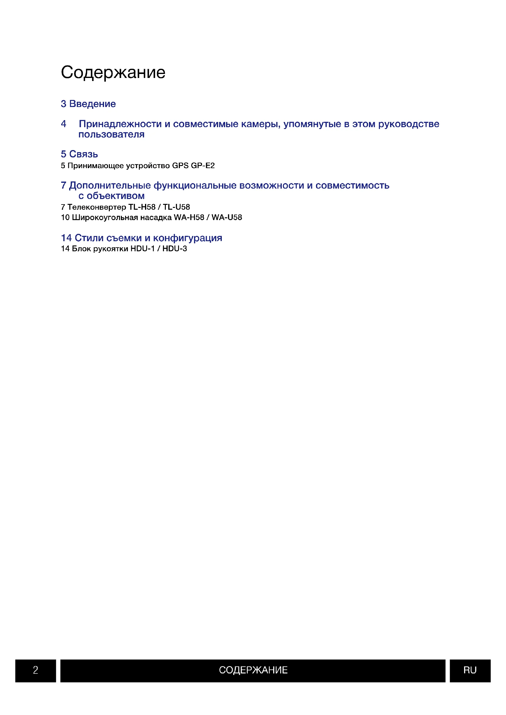 3 Введение 4 Принадлежности и совместимые камеры, упомянутые в этом руководстве пользователя 5 Связь 5 Принимающее устройство GPS GP-E2 7 Дополнительные функциональные возможности и совместимость с объективом 7 Телеконвертер TL-H58 / TL-U58 10 Широкоугольная насадка WA-H58 / WA-U58 14 Стили съемки и конфигурация 14 Блок рукоятки HDU-1 / HDU-3 СодержаниеВВЕДЕНИЕ