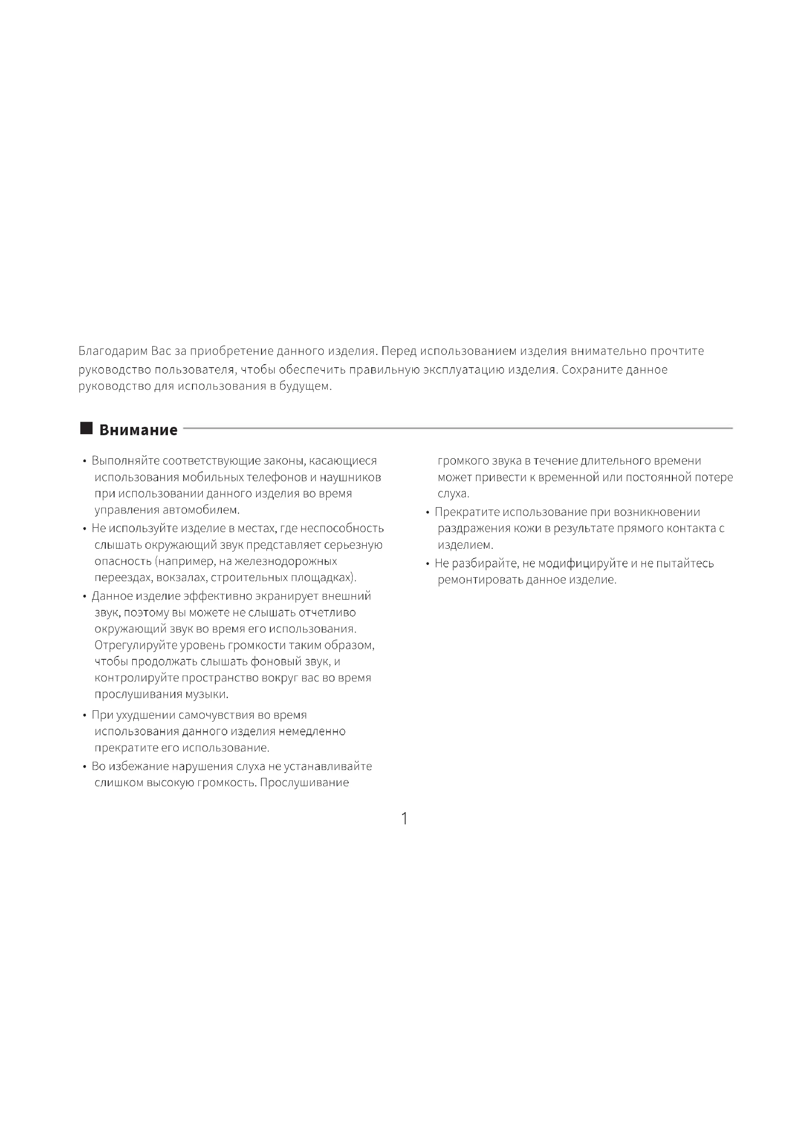 - Не используйте изделие в местах, где неспособность слышать окружающий звук представляет серьезную опасность (например, на железнодорожных переездах, вокзалах, строительных площадках).