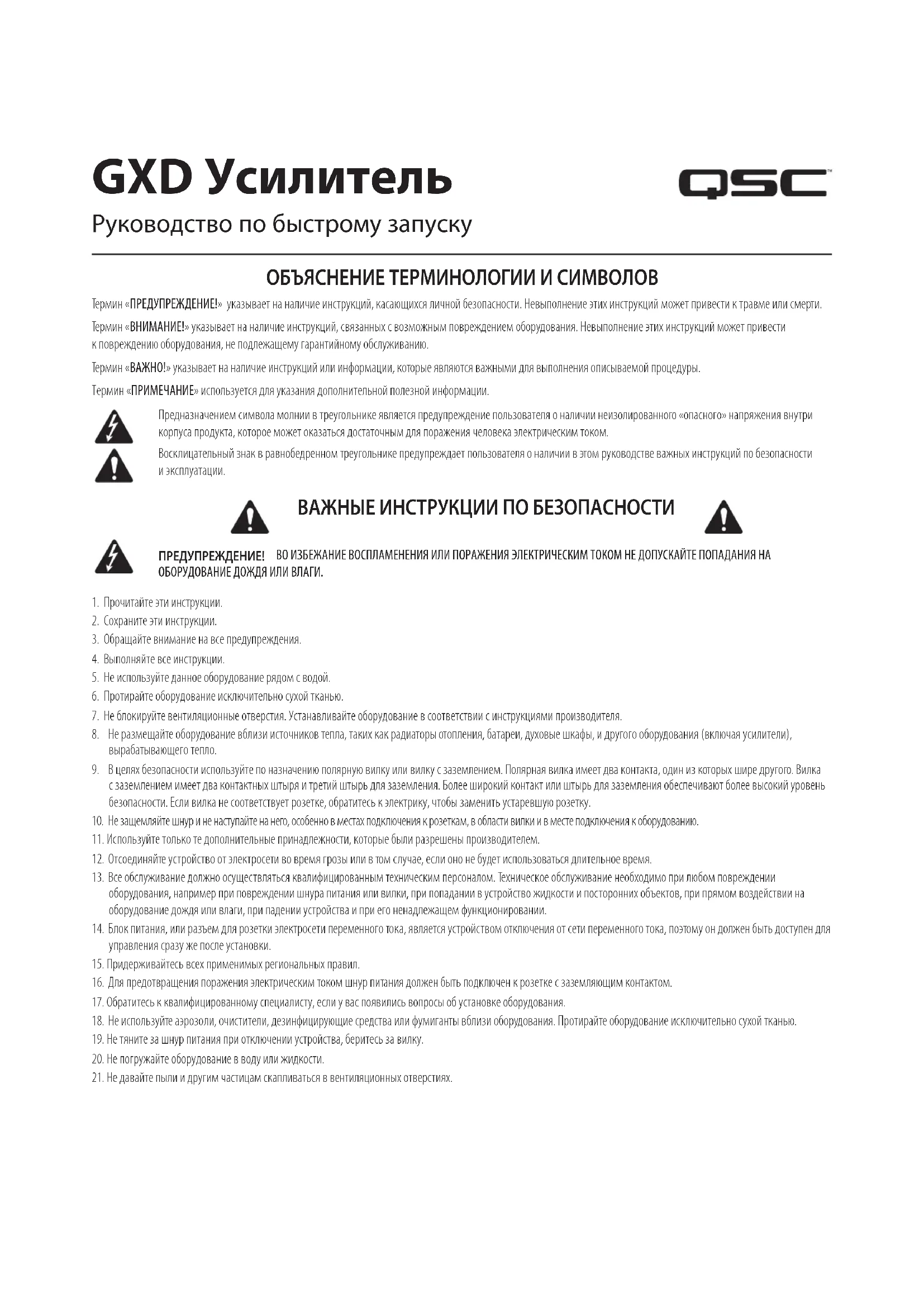 +1 714957-7150 © 2014 QSC Audio Products, LLC. 保留所有权利。QSC和QSC徽标是QSC Audio Products, LLC在美国和其他国家/地区的注册商标。 其它所有商标均归各自所有者拥有。 http://patents.qsc.com.GXD Усилитель Руководство по быстрому запуску ОБЪЯСНЕНИЕ ТЕРМИНОЛОГИИ И СИМВОЛОВ Термин «ПРЕДУПРЕЖДЕНИЕ!» указывает на наличие инструкций, касающихся личной безопасности. Невыполнение этих инструкций может привести к травме или смерти. Термин «ВНИМАНИЕ!» указывает на наличие инструкций, связанных с возможным повреждением оборудования. Невыполнение этих инструкций может привести кповреждению оборудования, не подлежащему гарантийному обслуживанию. Термин «ВАЖНО!» указывает на наличие инструкций или информации, которые являются важными для выполнения описываемой процедуры. Термин «ПРИМЕЧАНИЕ» используется для указания дополнительной полезной информации. Предназначением символа молнии в треугольнике является предупреждение пользователя о наличии неизолированного «опасного» напряжения внутри корпуса продукта, которое может оказаться достаточным для поражения человека электрическим током. Восклицательный знак в равнобедренном треугольнике предупреждает пользователя о наличии в этом руководстве важных инструкций по безопасности иэксплуатации. ВАЖНЫЕ ИНСТРУКЦИИ ПО БЕЗОПАСНОСТИ ПРЕДУПРЕЖДЕНИЕ! ВО ИЗБЕЖАНИЕ ВОСПЛАМЕНЕНИЯ ИЛИ ПОРАЖЕНИЯ ЭЛЕКТРИЧЕСКИМ ТОКОМ НЕ ДОПУСКАЙТЕ ПОПАДАНИЯ НА ОБОРУДОВАНИЕ ДОЖДЯ ИЛИ ВЛАГИ.