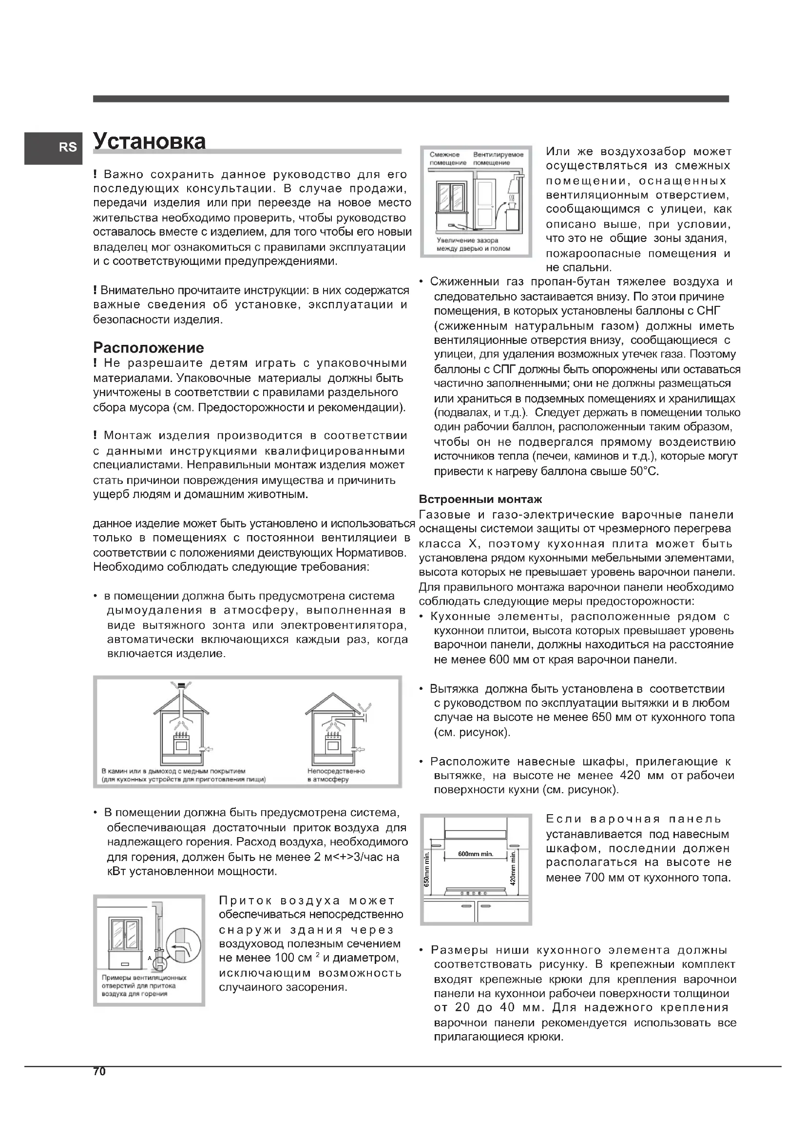 ! Важно сохранить данное руководство для его последующих консультации. В случае продажи, передачи изделия или при переезде на новое место жительства необходимо проверить, чтобы руководство оставалось вместе с изделием, для того чтобы его новыи владелец мог ознакомиться с правилами эксплуатации и с соответствующими предупреждениями. ! Внимательно прочитаите инструкции: в них содержатся важные сведения об установке, эксплуатации и безопасности изделия. Расположение ! Не разрешаите детям играть с упаковочными материалами. Упаковочные материалы должны быть уничтожены в соответствии с правилами раздельного сбора мусора (см. Предосторожности и рекомендации). ! Монтаж изделия производится в соответствии с данными инструкциями квалифицированными специалистами. Неправильныи монтаж изделия может стать причинои повреждения имущества и причинить ущерб людям и домашним животным. данное изделие может быть установлено и использоваться только в помещениях с постояннои вентиляциеи в соответствии с положениями деиствующих Нормативов. Необходимо соблюдать следующие требования: