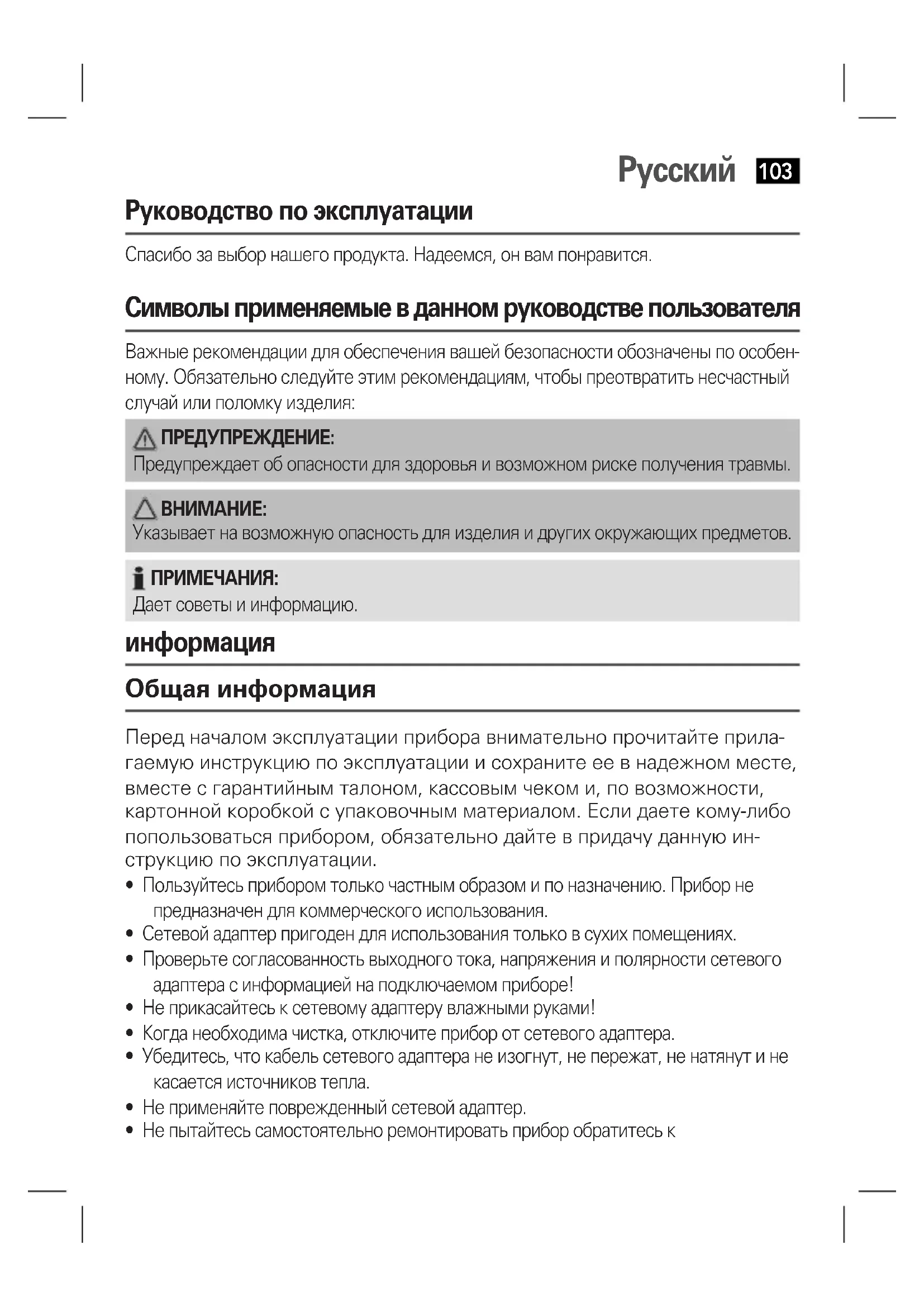 Общая информация Перед началом эксплуатации прибора внимательно прочитайте прила- гаемую инструкцию по эксплуатации и сохраните ее в надежном месте, вместе с гарантийным талоном, кассовым чеком и, по возможности, картонной коробкой с упаковочным материалом. Если даете кому-либо попользоваться прибором, обязательно дайте в придачу данную ин- струкцию по эксплуатации.